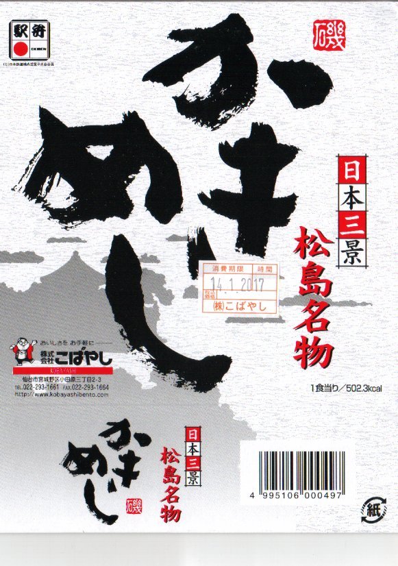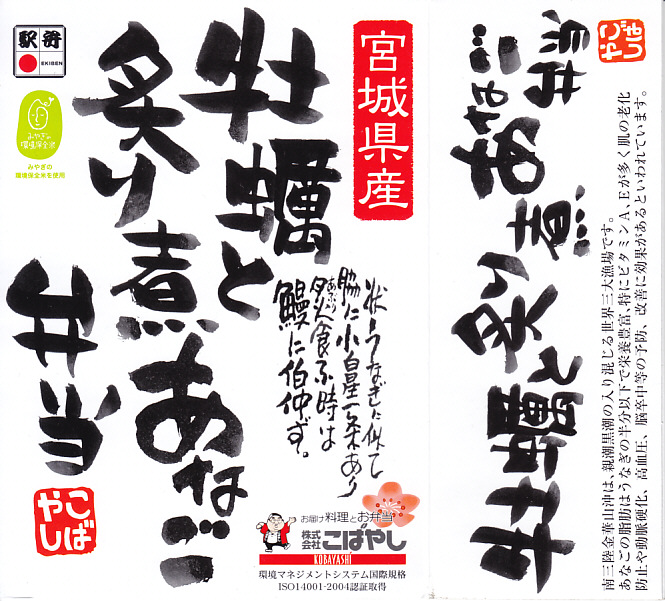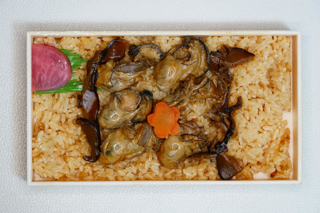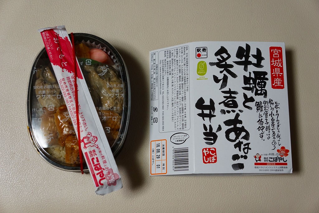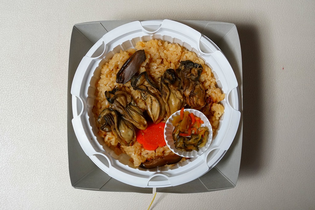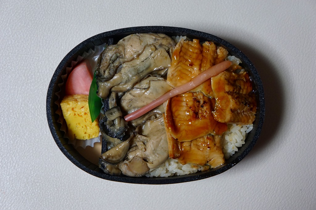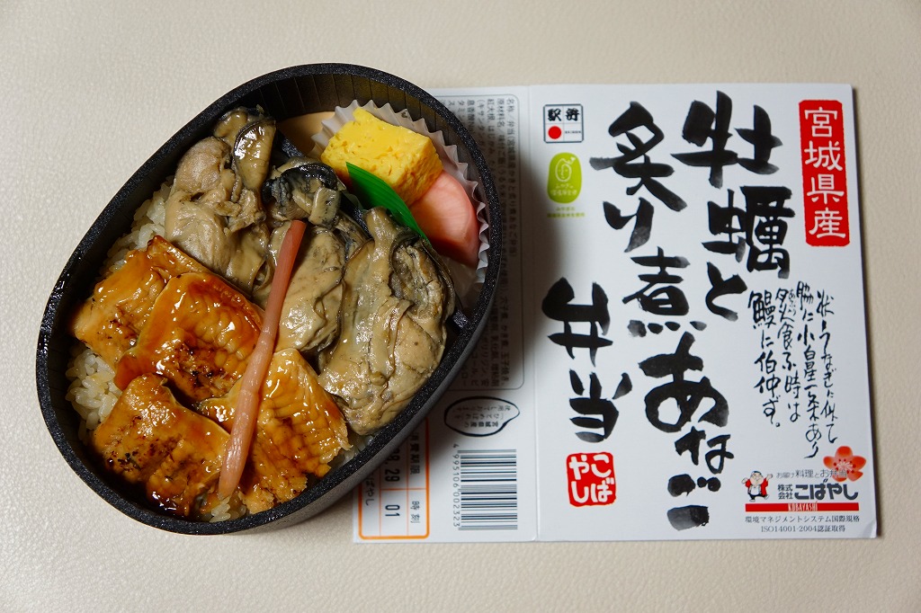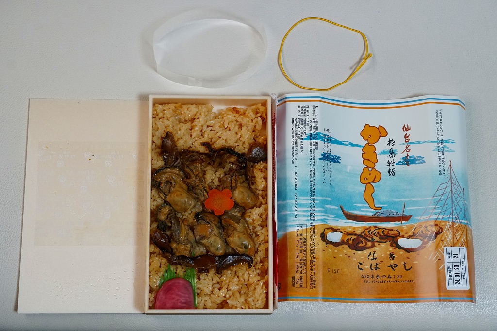 2015(平成27)年3月頃の発売か。楕円形の容器に宮城米ひとめぼれの味付飯を詰め、いずれも宮城県産というカキ煮とアナゴ煮で覆い、はじかみ、厚焼玉子、紅大根を添える、シンプルな駅弁。カキの粒もアナゴの刻み方もやや大きめで、常温で飯に合う適度な柔らかさと香りと味付けを持っていたと思う。パッケージの記述も含め、余計なものがないので、ストレートに味と腹を楽しめる駅弁。2019年までの販売か。
