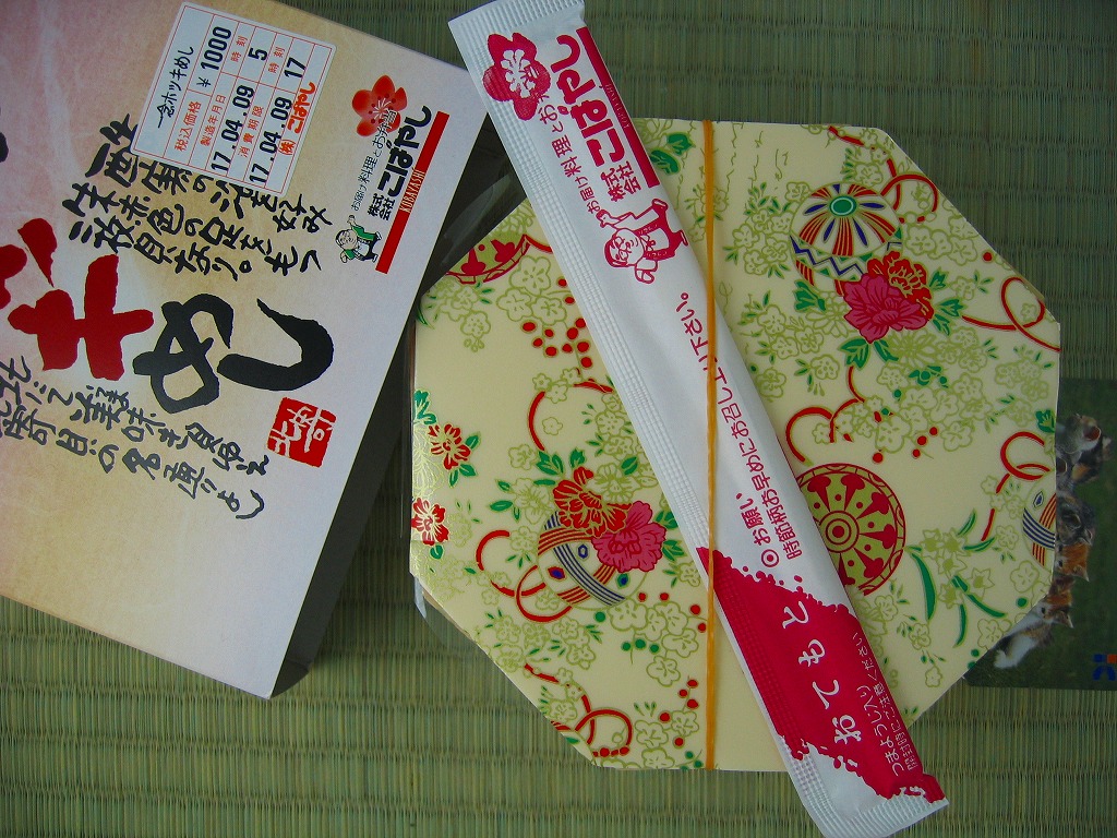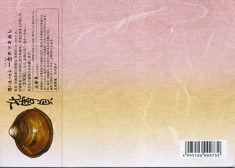 2004(平成16)年10月に発売。正八角形の容器に柄物のふたをかけて、駅弁の名前など文字をたくさん書いたボール紙の枠にはめる。中身は宮城産米ひとめぼれをホッキのゆで汁で炊いた茶飯にホッキをパラパラと載せて、しめじとホタテと笹蒲鉾を添える。