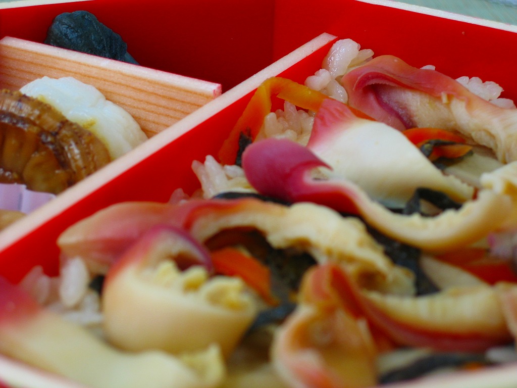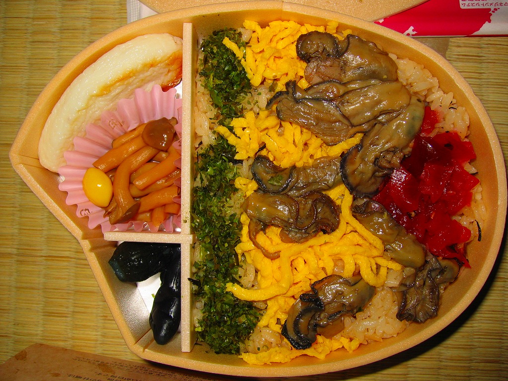 正方形のボール紙製パッケージに正八角形の容器を入れる。中身はひじき御飯の上にハマグリやタケノコに錦糸卵や刻み海苔など、そしてカキが無造作に載せられている。御飯が上から見えているので写真映りが悪いが、福神漬けの臭いがカキ他の食材に染み付いてなければ、かなり良い味が出ていたのではと思う。現存しない模様。