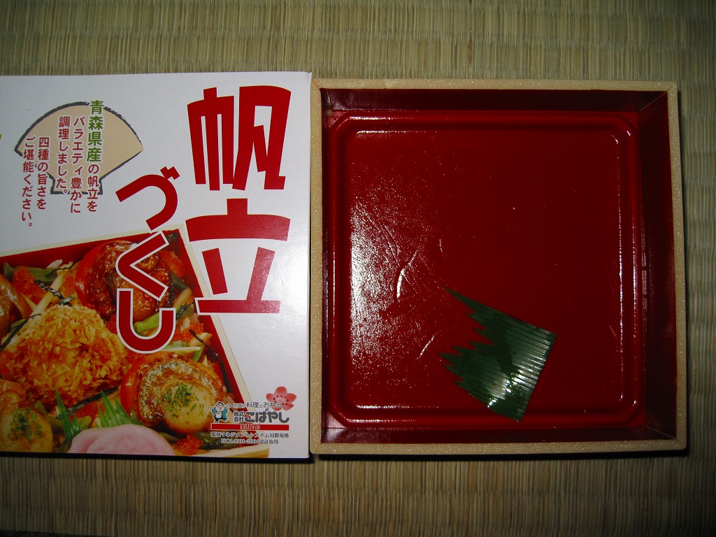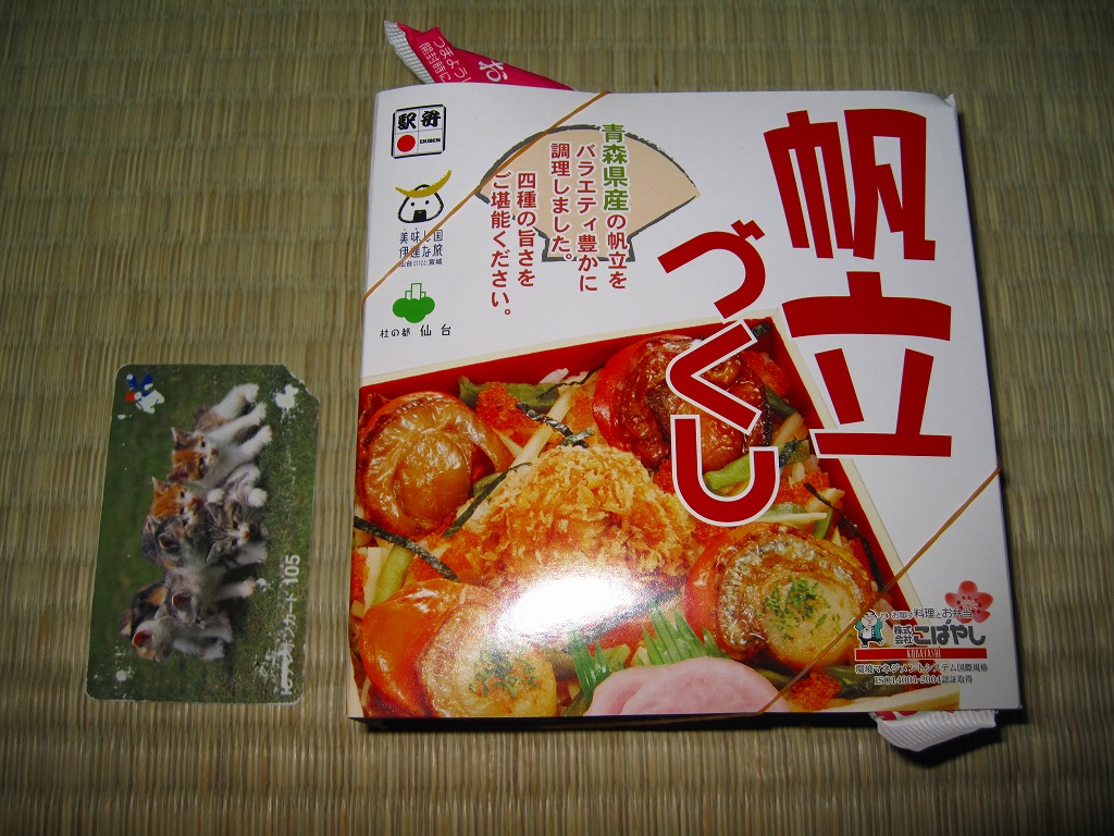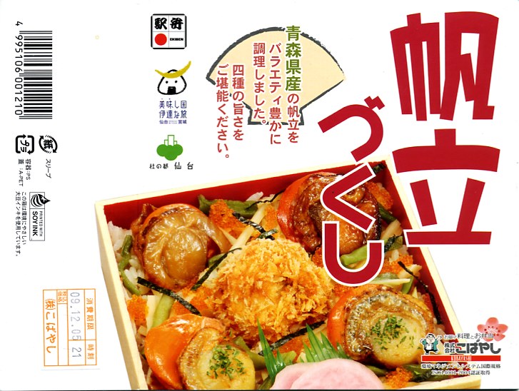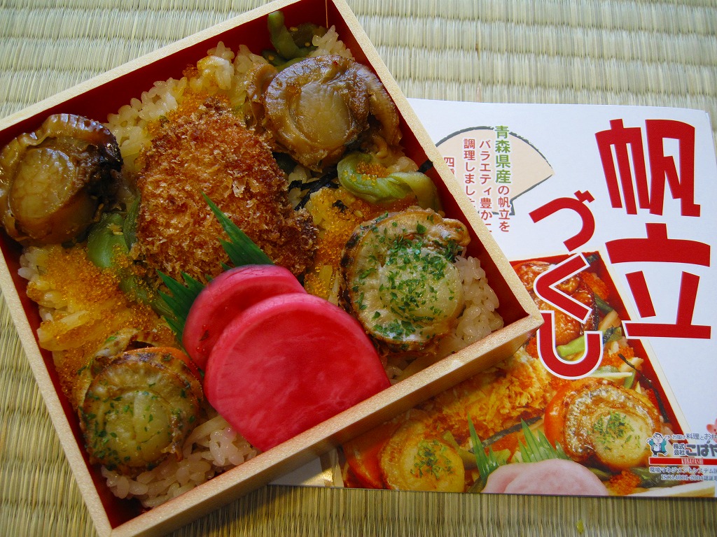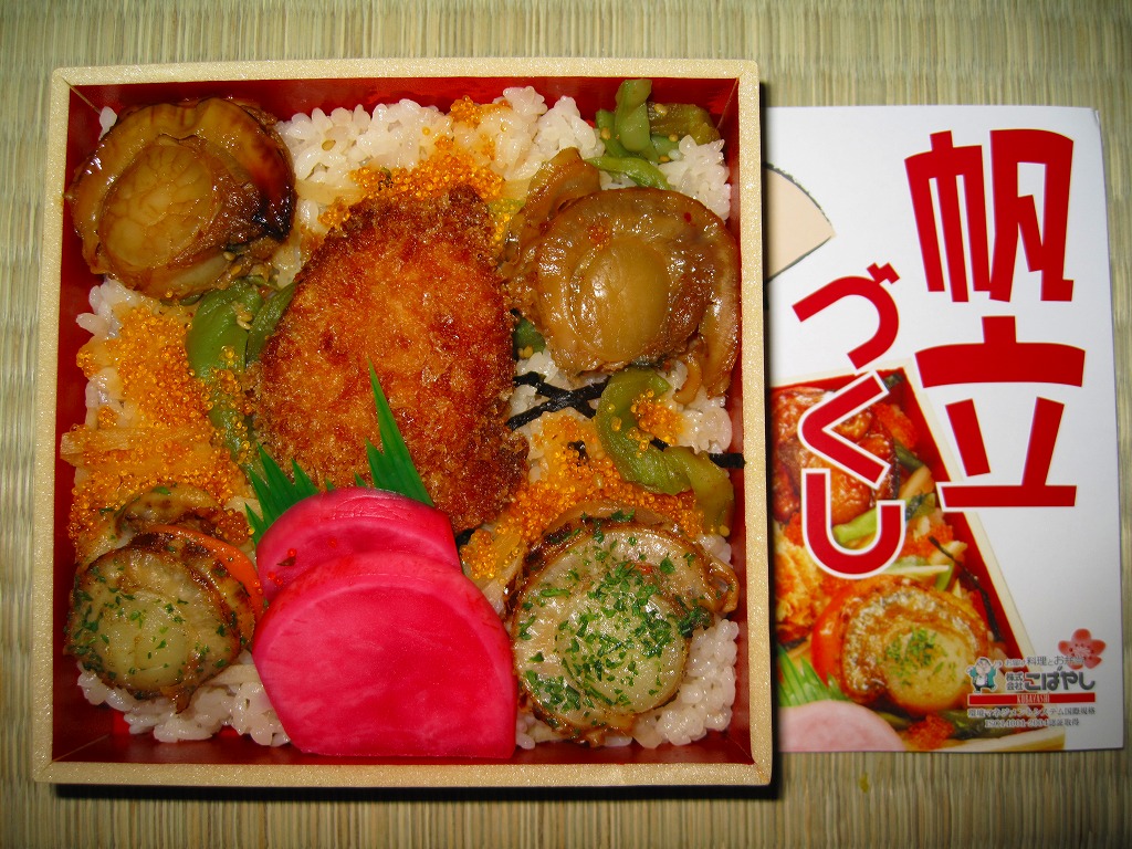 2009(平成21)年9月1日に発売。なかなか小柄な正方形の容器に透明なふたをして、割りばしを置いてから商品名と中身の写真を印刷したボール紙の枠にはめて、輪ゴムでしばる。中身は茶飯の上にホタテのフライを1個、バター焼きを2個、照り焼きを2個置いて、トビッコと山くらげを撒いて赤かぶ漬を添えるもの。内容そのものに新鮮味はないが、ホタテの風味がよくある醤油漬でなく上記の通り各種があるため、新しい都会的な印象が香る。価格も良好。2010年に「まるごと帆立づくし」(750円)へリニューアル、2014年2月に800円へ値上げ、2017年までの販売か。