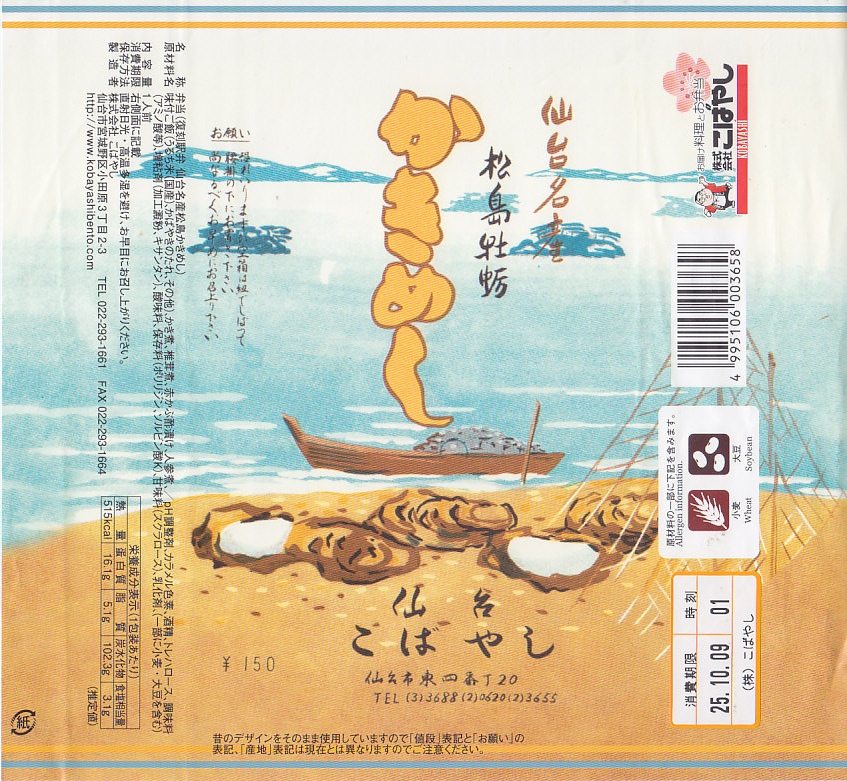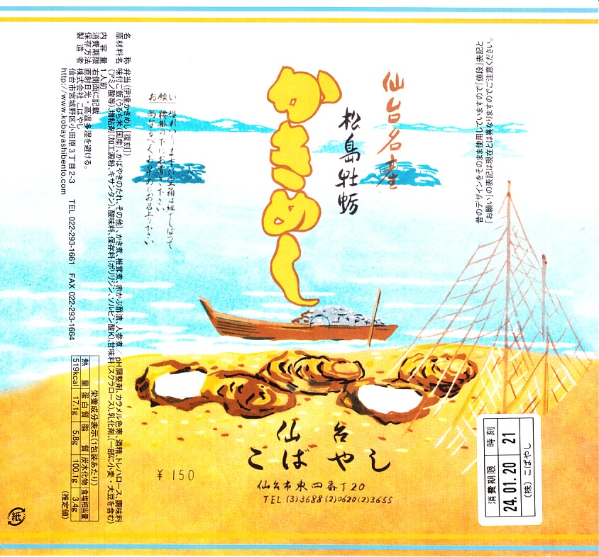 やったことは、下記の2024年の京王百貨店の駅弁大会の時と同じ。ここでは約50年前に販売していた駅弁「仙台名産松島牡蠣かきめし」について、当時の掛け紙デザインを使用したとした。中身を「宮城県産かきを生姜を効かせてふっくら炊き、その煮汁を混ぜた味付けご飯のシンプルかつ奥が深いかきめしです。」と紹介した、つまりカキ飯であり、現役の駅弁「伊達かきめし」の常温版という感じ。価格は当然に「¥150」ではないが、この年の宮城県産カキの生育の遅れや大量死を反映してか、価格が2年前より400円も上がった。