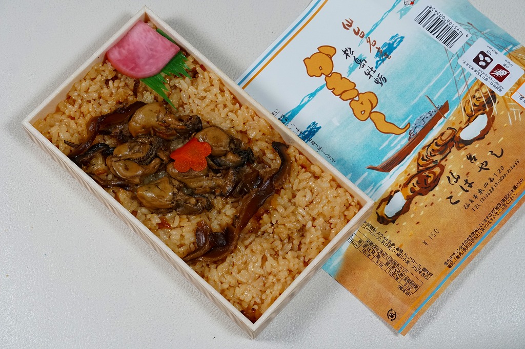 2004(平成16)年10月5日に発売。おそらく下記の駅弁「磯かきめし」をリニューアルしたものと思われる。前年の夏に販売された駅弁「とことん宮城弁当」で使った米粒型の容器を、松島五大堂を簡単に描いたボール紙の枠にはめる。中身はカキのエキスで炊いた宮城県産ひとめぼれの御飯に、青のりと錦糸卵と福神漬、そして風味も食感も豊かなカキを8個ほど載せて、シメジや笹蒲鉾を添える。