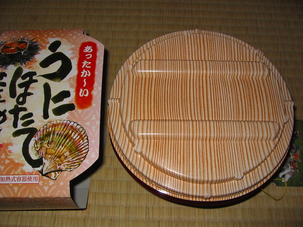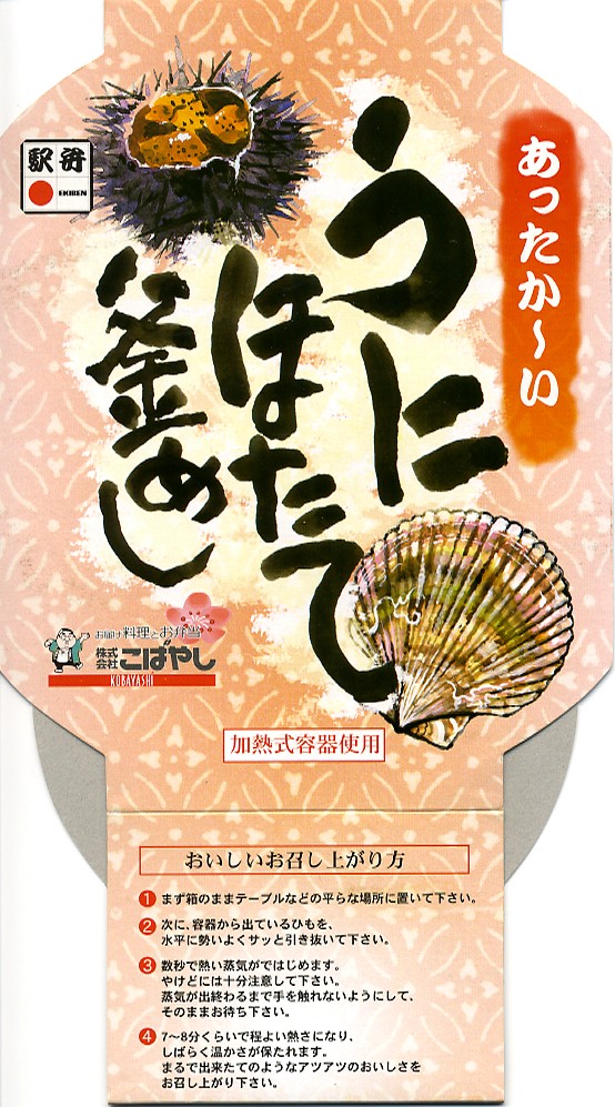 秋冬の駅弁大会シーズンに向けた、2004(平成16)年秋の新商品か。円形の加熱機能付き容器を、ウニとホタテを描いたボール紙の枠にはめる。中身は宮城産ひとめぼれを使ったホタテひじき御飯の上に、蒸しウニと煮ホタテと福神漬をパラパラと載せるもの。暖かいウニというのも変な感じで、価格も少々高いが、全体の風味として駅弁の名前どおりの暖かさを感じる。このシーズンのみの販売か。