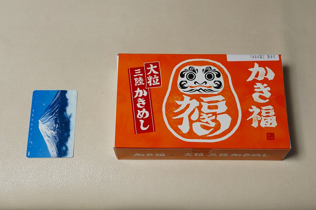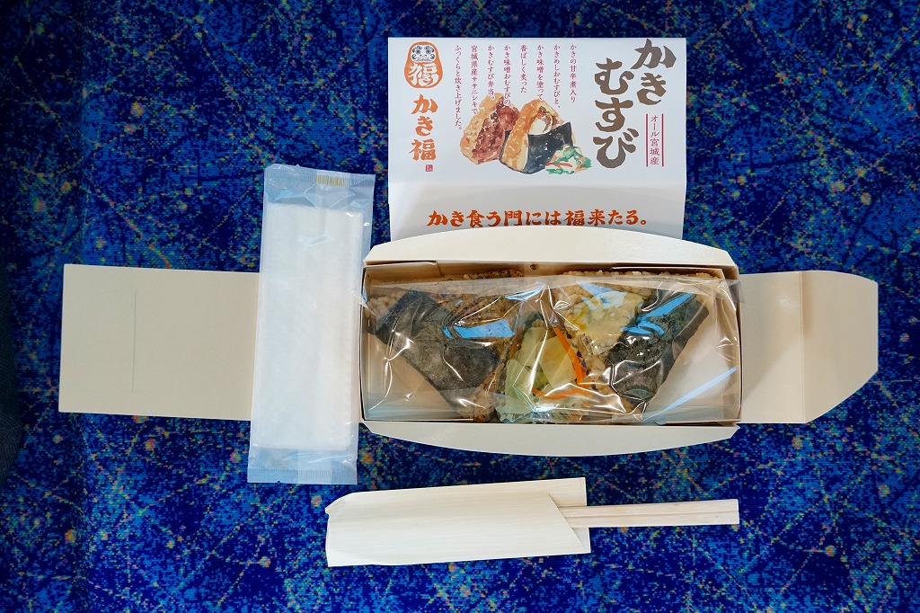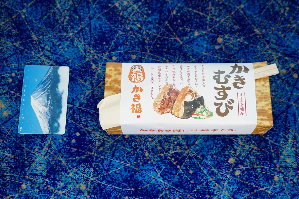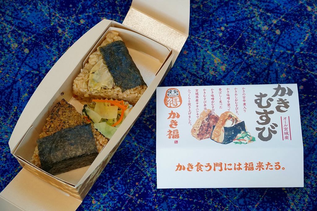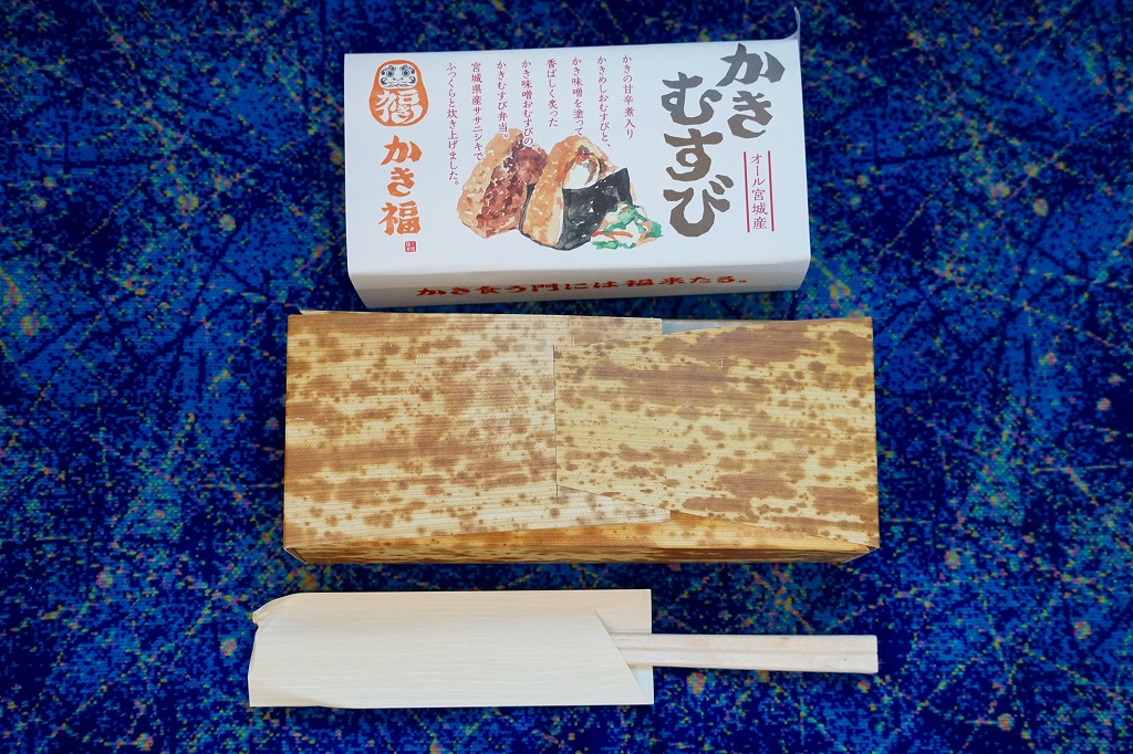 2018(平成30)年の夏に発売か。下記の駅弁「かき福大粒三陸かきめし」の、カキ御飯をおむすびにしたものだろう。白と黒の型押しカキ飯と漬物を、竹皮柄の紙箱に収めていた。2022年までの販売か。