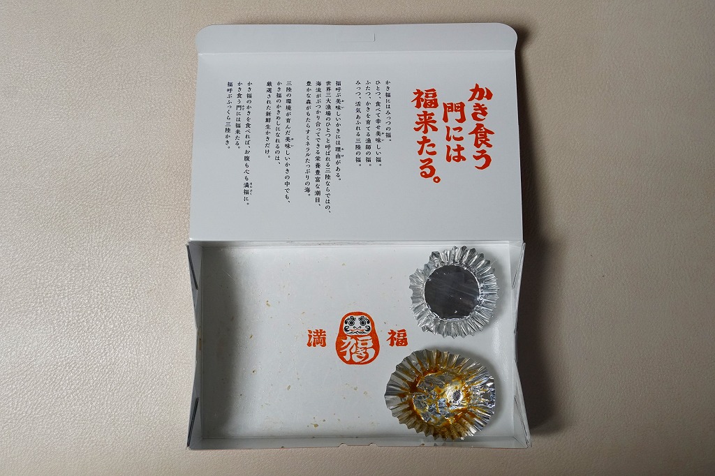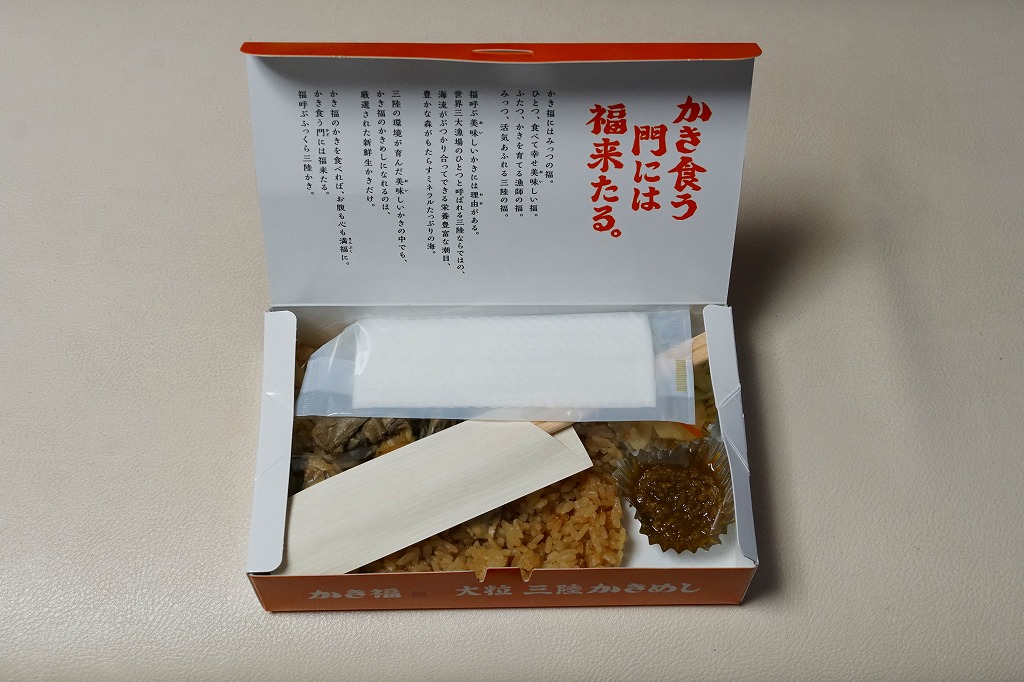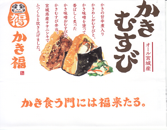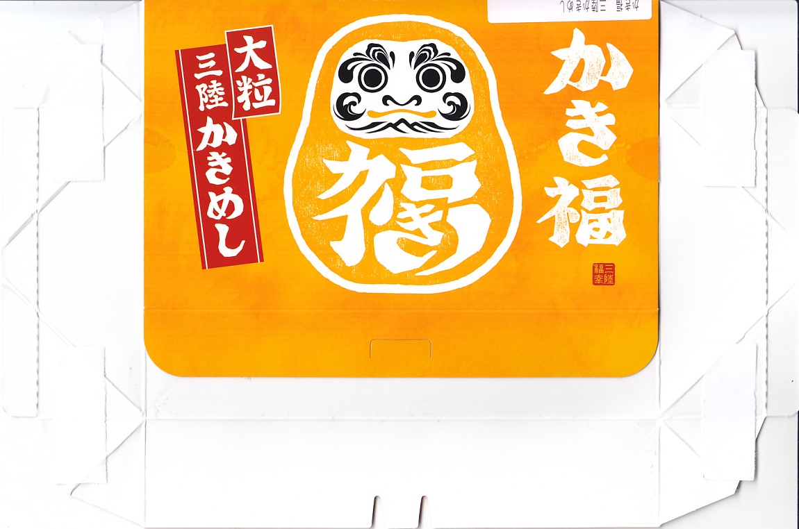 東京都港区のデザイン会社による耐水紙製パッケージでは、商品名とダルマをオレンジ色にアレンジ。ふたの裏側には「かき食う門には福来たる。」というポエムを記す。この箱に直接詰められた中身は、カキのだし汁で炊いた宮城県産ササニシキの御飯に、カキの炙り蒸しと生姜煮を散らし、牡蠣味噌と蔵王菜だいこん漬を添えるもの。