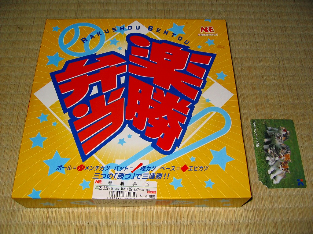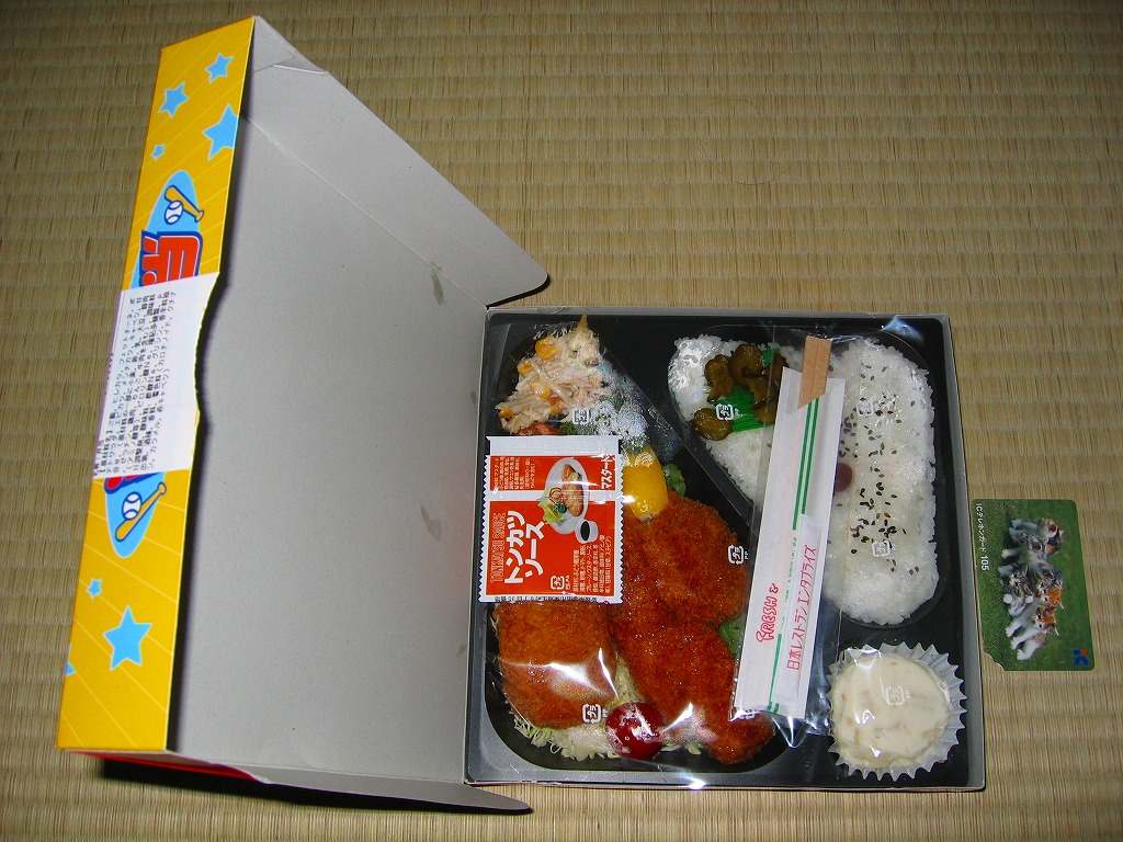 中身は白御飯の上にチキンカツ、鶏肉のパン粉焼き、ほうれんそう炒め、刻みニンジン、ゼンマイを載せるもの。これもまた「タイガース勝めし」とよく似ているし、おそらく勝つとカツをかけたのだろう。御飯は白ではなく茶飯や洋食系のほうが、油ものの味が生きると思った。この年のみの販売か。
