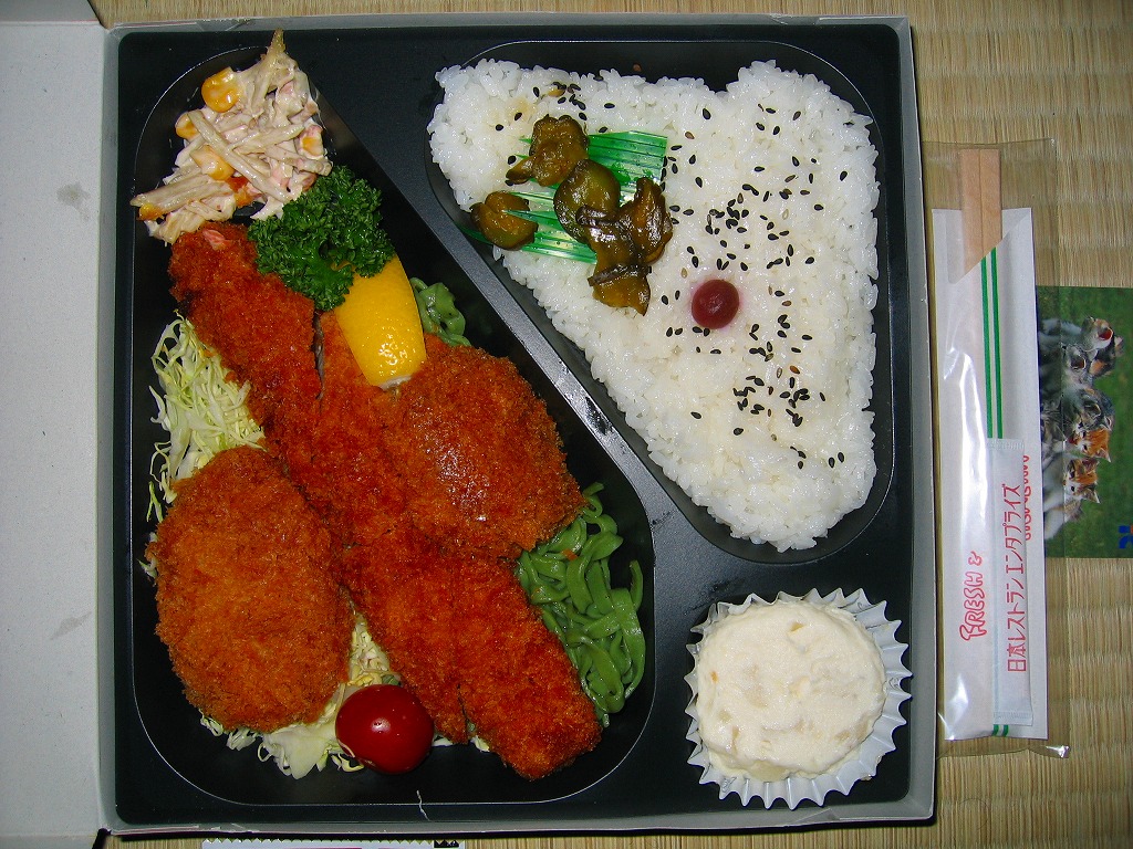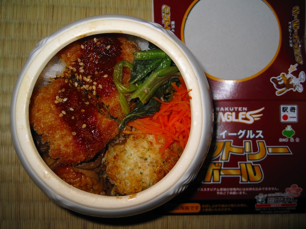 プロ野球「東北楽天ゴールデンイーグルズ」の仙台進出にあやかって、2004(平成16)年12月頃に発売。大きな長方形のボール紙製パッケージには、バットとボールとダイヤモンド(内野)のイラストを描く。中身は日の丸御飯にメンチカツと棒カツとエビカツ、その下にたっぷりの千切りキャベツやフェットチーネを敷き、ポテトフライなどを添えるもの。現存しない模様。