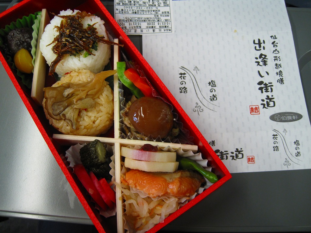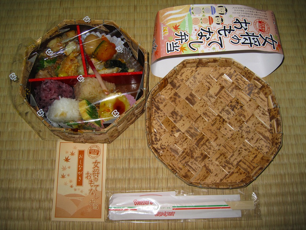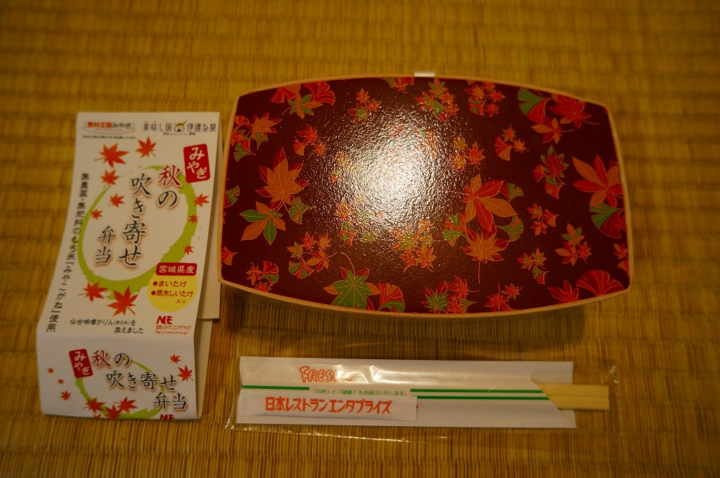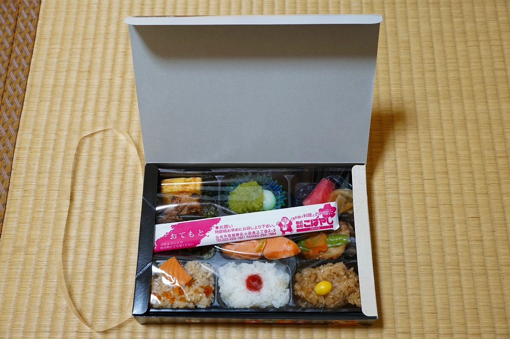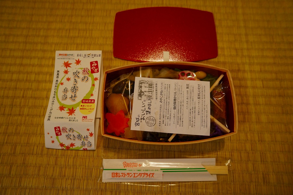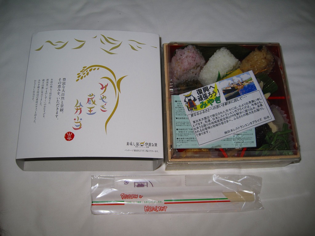 中身は宮城県産ひとめぼれの白飯むすびとひじき飯むすびが各1個と、鮭の酒粕漬け焼、ナスやカボチャなど野菜の素揚げ、昆布佃煮、笹かまぼことカステラ蒲鉾、ミニクッキー2種など。個々の料理に不協和音が聞こえるものの、見栄えと個々の味はきれいな感じ。以後も2015年頃まで販売された模様。