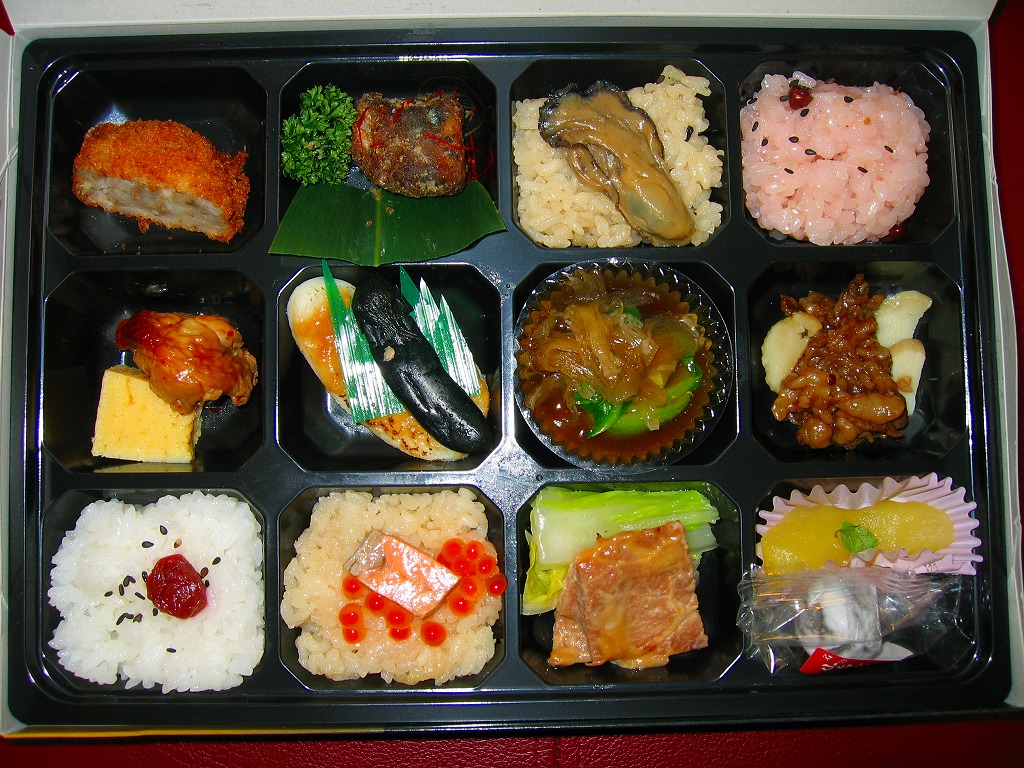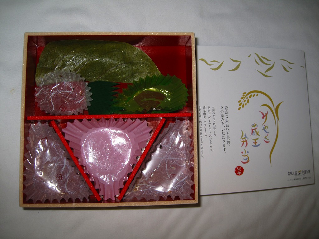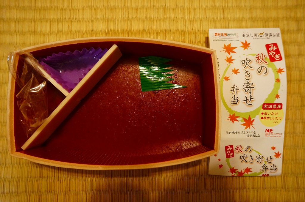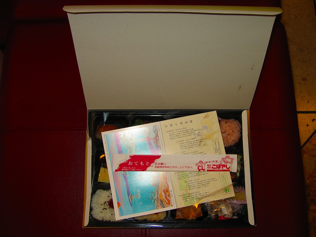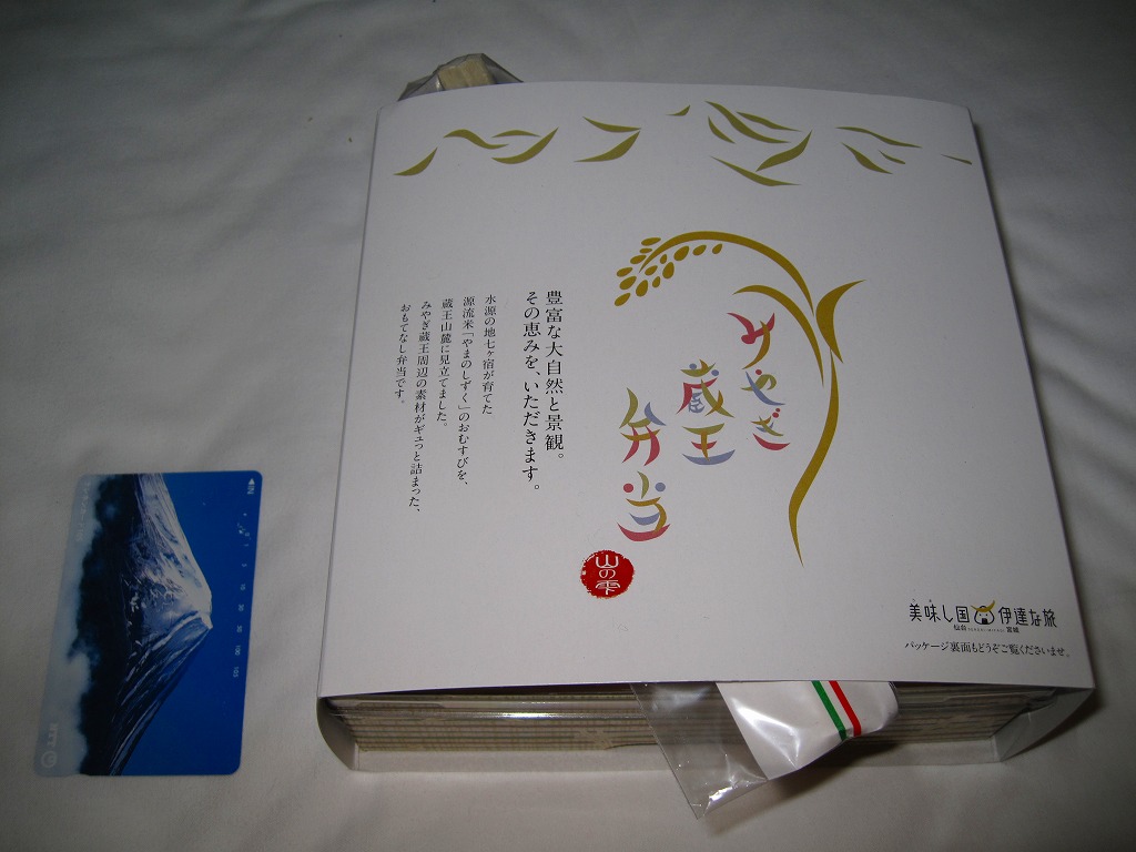 中身は宮城県産ひとめぼれの白飯むすびとひじき飯むすびが各1個と、鮭の酒粕漬け焼、ナスやカボチャなど野菜の素揚げ、昆布佃煮、笹かまぼことカステラ蒲鉾、ミニクッキー2種など。個々の料理に不協和音が聞こえるものの、見栄えと個々の味はきれいな感じ。以後も2015年頃まで販売された模様。