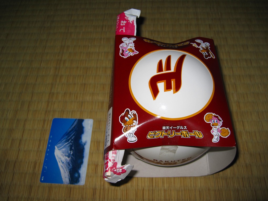 東北新幹線はやぶさ号デビューを記念して、2011(平成23)年3月5〜6日に東京駅で開催された、第13回東日本縦断駅弁大会で発売か。新神戸駅弁「タイガース勝めし」と同じ、野球のボールをもした白い球形の陶器を使用、これに仙台に本拠地を置くプロ野球団「東北楽天ゴールデンイーグルス」の公式ロゴマークをプリントしたうえで、そのイメージカラーに染めたボール紙の枠にはめる。
