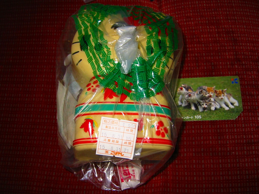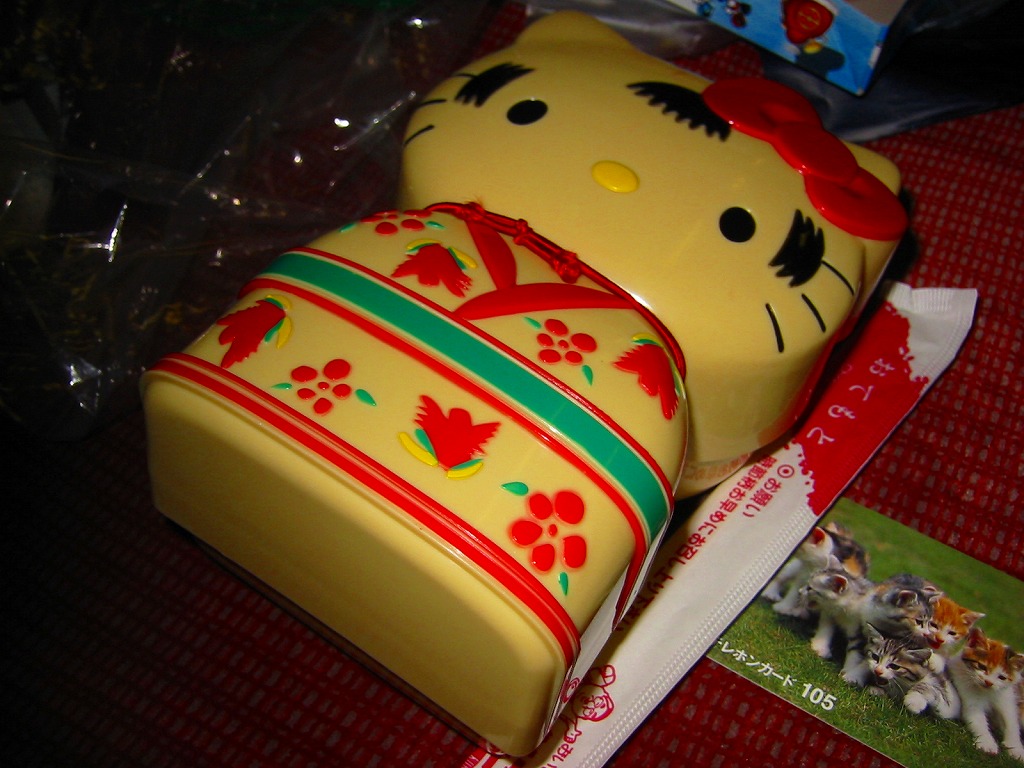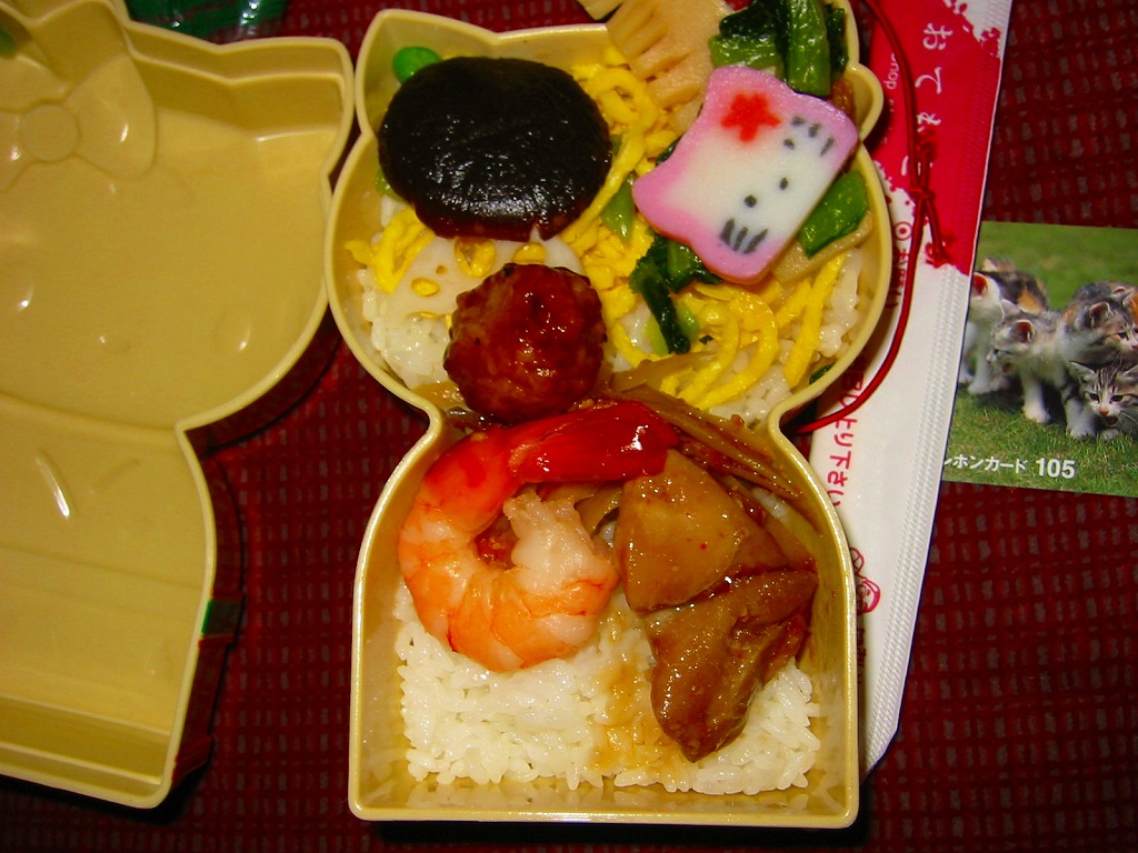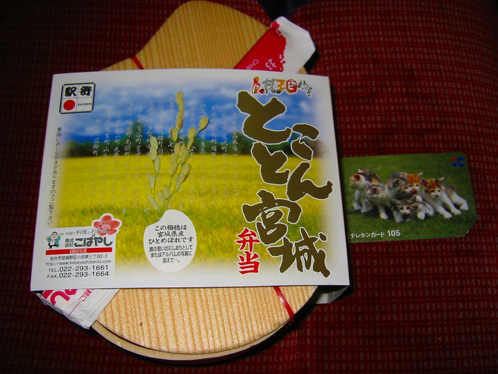 岡山駅、高崎駅、小田原駅に次ぐキティちゃん駅弁として、2003(平成15)年1月に発売か。キティちゃんが着物を着てこけしになったプラ容器を使用。中身は減農薬宮城県産ひとめぼれの御飯に、焼鳥やつくね団子や海老に、椎茸やタケノコの煮物、そして金太郎飴タイプのキティちゃん蒲鉾が入る。仙台駅弁にしては価格の割に中身が薄く、これは容器を楽しむ駅弁。2005年頃までの販売か。