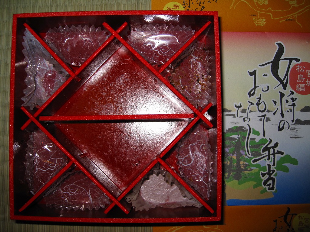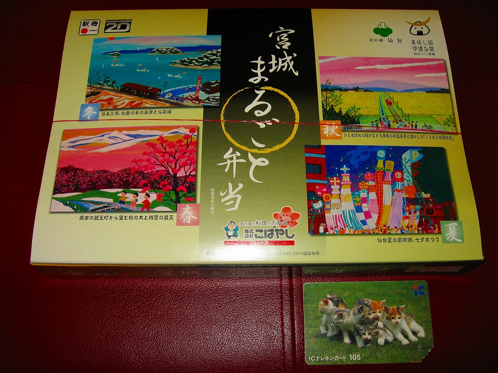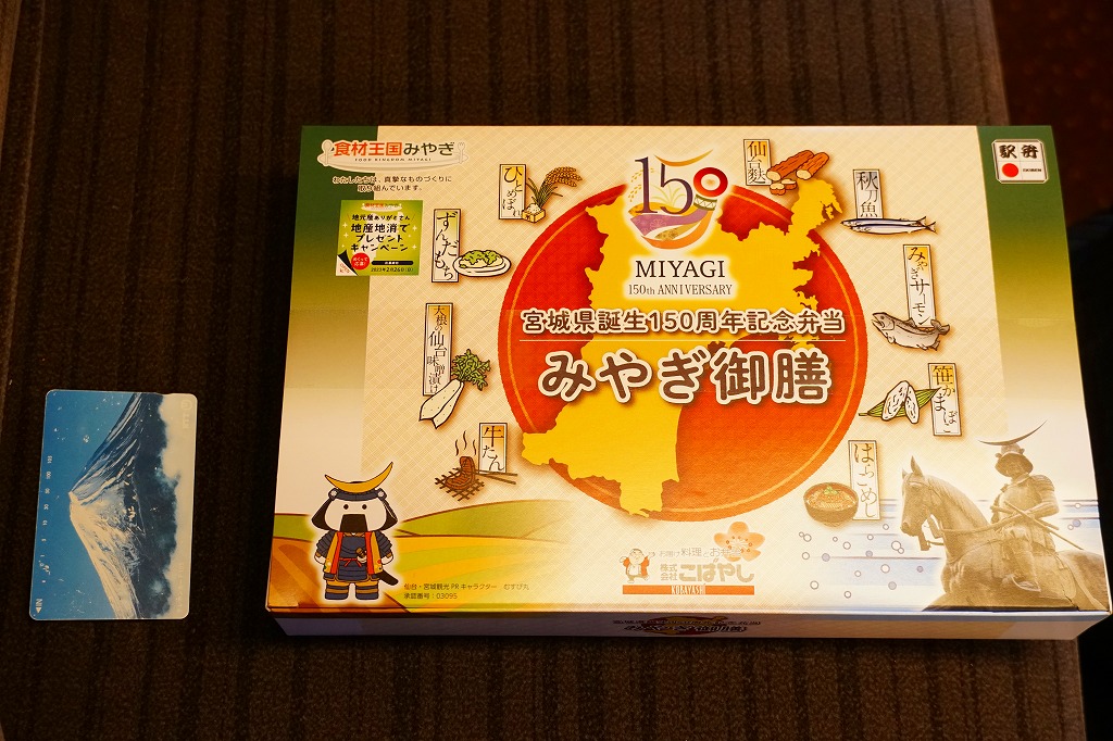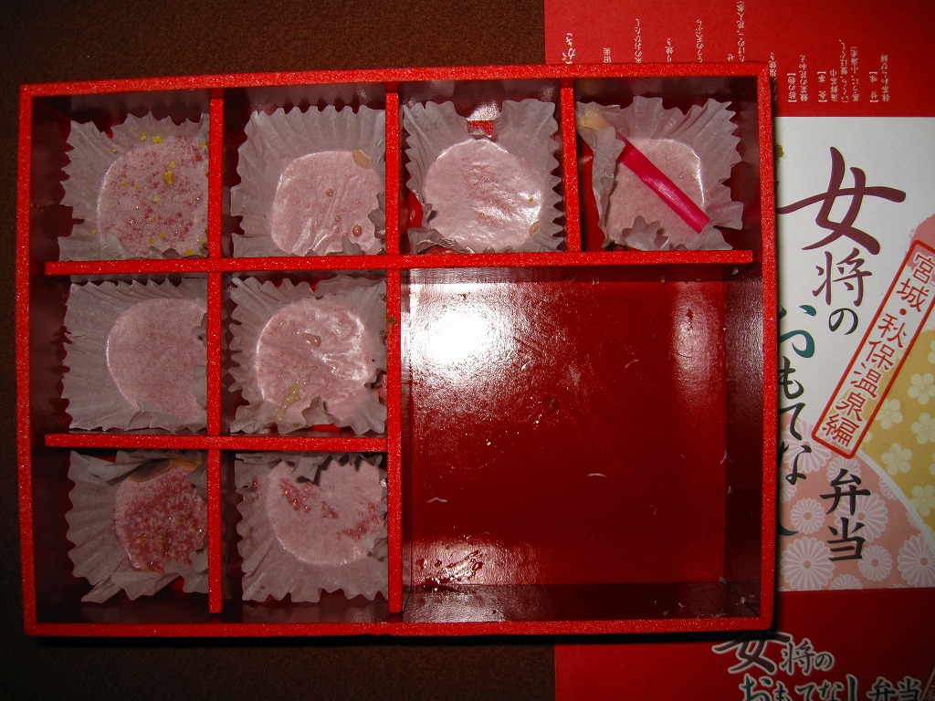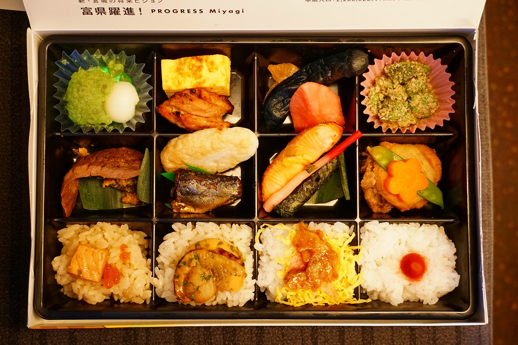 12区画のトレーに入る中身は、日の丸、鮭いくら、カキ、赤飯で4種類の御飯と、フカヒレあんかけ、牛たんコロッケ、もち豚味噌焼、牛肉エリンギ炒め、鶏照焼と玉子焼、サンマ竜田揚、笹蒲鉾と駄菓子など。それぞれが仙台や宮城にちなむことがおしながきで確認でき、これは季節の絵柄を採用した絵葉書を兼ねる。コンセプトに忠実な演出系で、風味も良好。宮城県が「食材王国みやぎ」を打ち出してから、駅弁に限らず宮城の食にしっかりとした筋が通った気がする。2011年頃までの販売か。