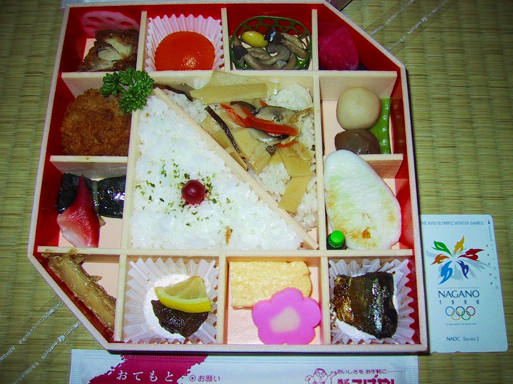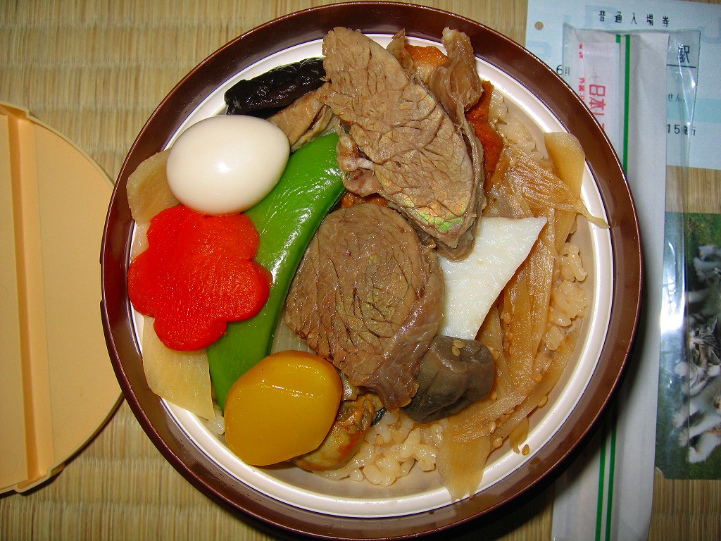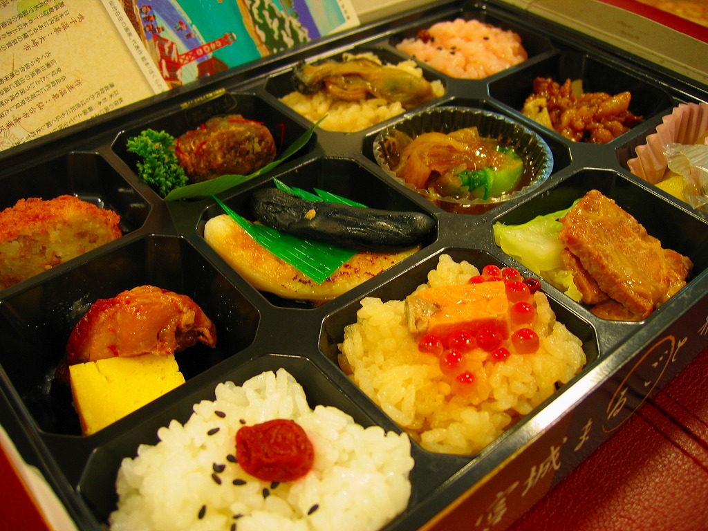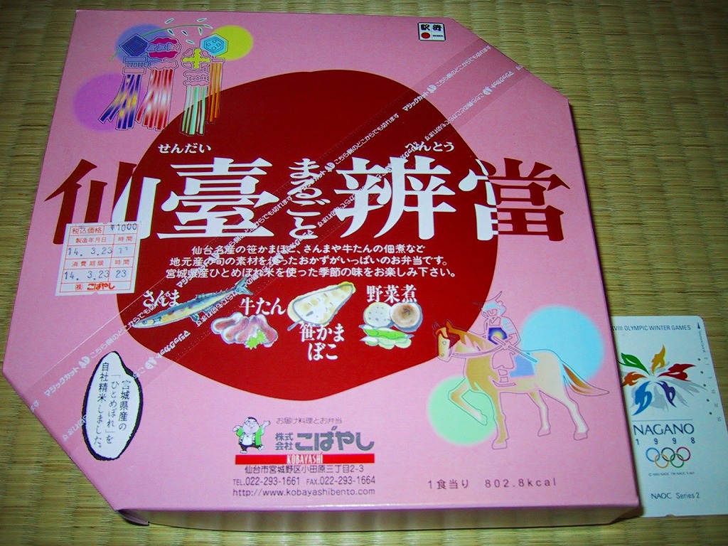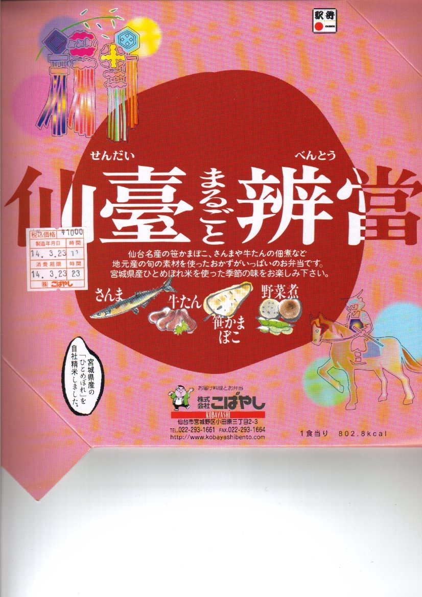 掛紙を兼ねる紙のふたをかけた正方形大の容器は、写真のように細かく仕切られる。真ん中は宮城米ひとめぼれを使用した白御飯と竹の子御飯(季節の御飯)、周囲にはさんま、牛タン佃煮、笹かまぼこ、野菜煮に厚焼き卵や男爵コロッケなど、ひとつひとつが丁寧に調理されたおかずが配置される。仙台駅弁は幕の内と名乗るものが最も美味いと思う。人間だけではなくインコも気になる味。2008年頃までの販売か。