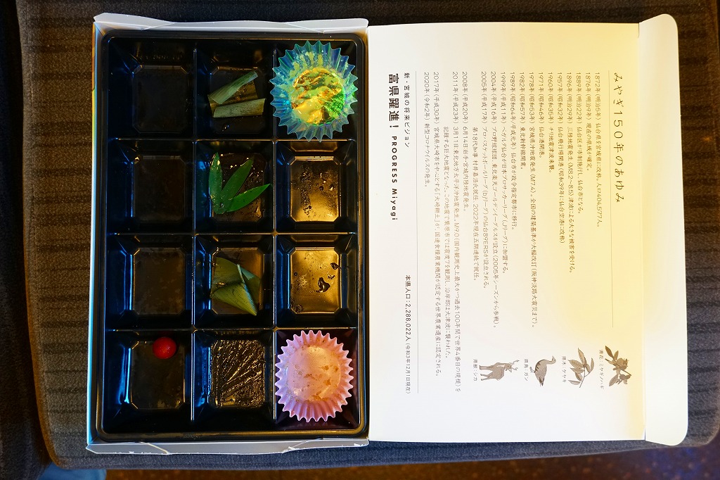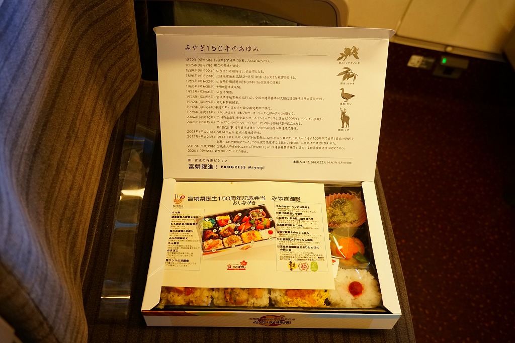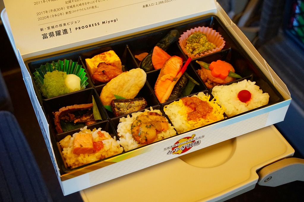 2023(令和5)年6月1日に仙台駅で発売。下記のとおり、似たような名前や中身の駅弁は、過去にも出ていたと思う。専用の紙箱で写真と地名と料理名により紹介する中身は、宮城県産環境保全米ひとめぼれの日の丸御飯、亘理名物はらこ飯、くるみおこわ、A5ランク仙台牛などの煮物と登米(とよま)名物あぶら麩煮、仙台名物牛たん焼きとこごみ胡麻和えと唐辛子、仙台名物笹かまぼこと三陸産銀鮭の柚香焼きと岩出山名産しそ巻き、宮城県産卵の厚焼き玉子と鶏肉の仙台味噌漬焼き、宮城名物ずんだ餅、仙台長茄子漬けと蔵王大根の味噌漬けと大根塩漬、宮城名物ずんだ餅。9区画に20種類以上の料理や食材を詰め込んだ、地理と郷土のお勉強。