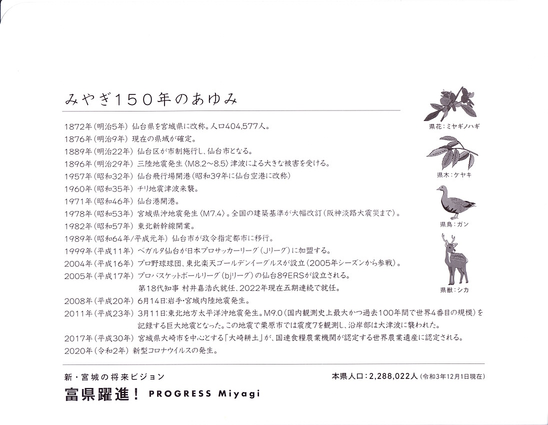 宮城県は明治5年1月8日(1872年2月16日)に、仙台県を改称してできた。1876(明治9)年内に、現在の岩手県や福島県との県境を動かして、今の形となる。日本が江戸時代から明治時代に移行した際の「廃藩置県」は、1871年、明治4年の出来事として社会科の授業で習うが、47の府県になるのに1888(明治21)年までかかったため、都道府県の誕生日は同じでない。東北6県の人口は、当時は福島県が最も多く、青森県が最も少なく、他の4県はあまり差がなかった。今では宮城県が1番で、福島県が次ぎ、他の4県にあまり差はない。