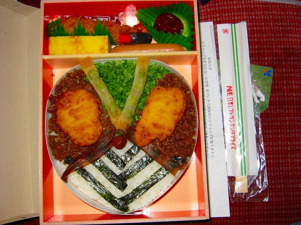 食べていて周囲の視線が気になるかもしれないが、洋風弁当としての味は良い。なお、発売開始当初はナゲットにケチャップを塗って目を表現していたそうだが、それがフィルムにべったり付いてしまうため別添となった模様。2003年内のみの販売か。