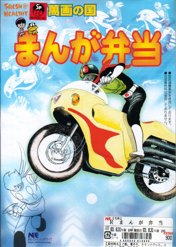 仙石線に登場した石ノ森章太郎キャラクター列車「マンガッタンライナー」に合わせて、仙台駅弁業者別に3種類が発売されたマンガ弁当の日本レストランエンタプライズ版として、2003(平成15)年3月22日に発売。仮面ライダー1号を描いたボール紙のふたを開けると、チキンナゲット・鶏そぼろ・青のり・海苔・かんぴょう・枝豆春巻で描いた、写真のとおり見事な仮面ライダー1号の顔が登場。他の具もソーセージに肉団子に海老フライと子供向け。