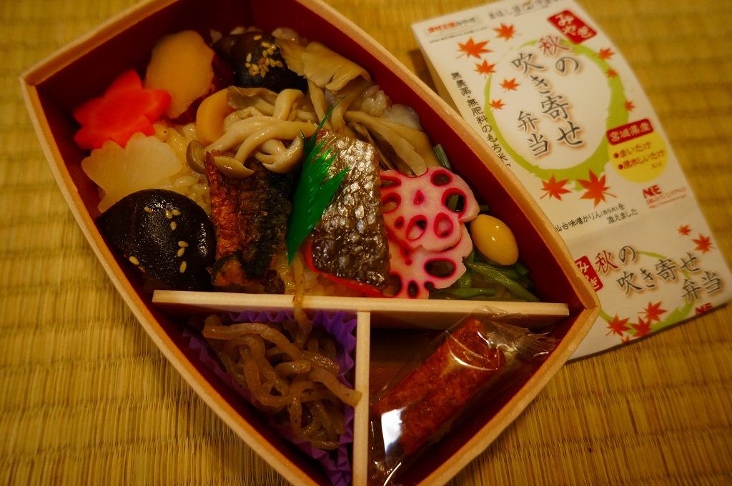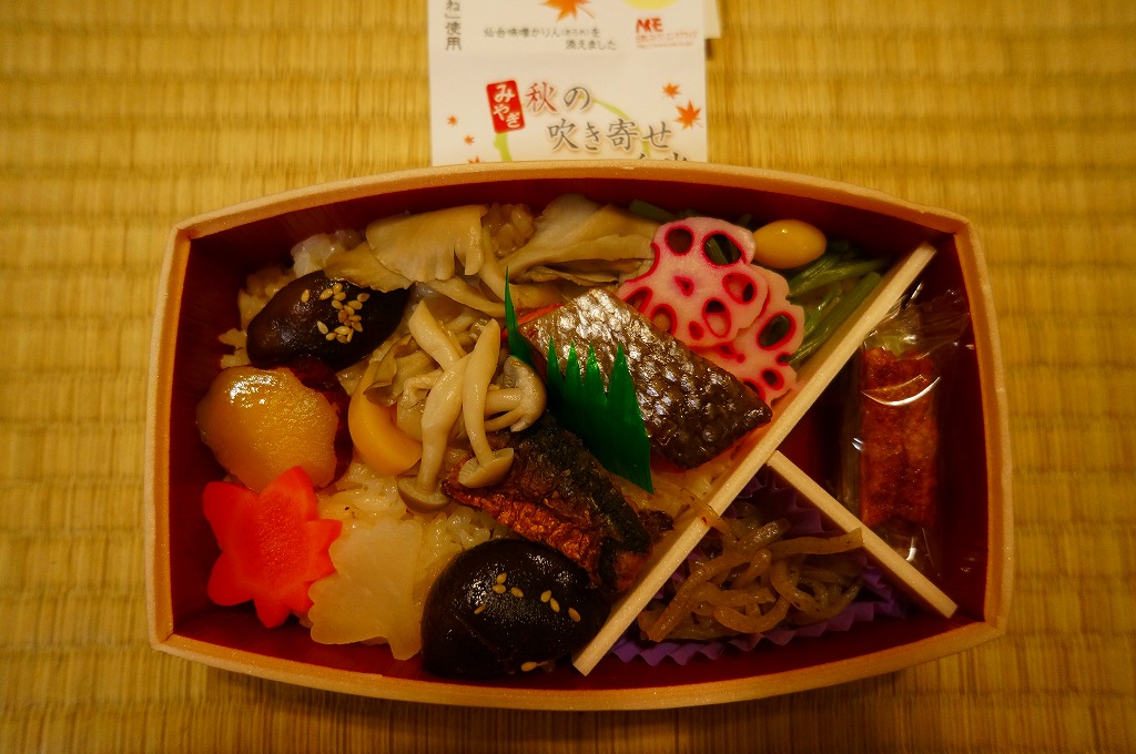 宮城県仙台地方振興事務所の支援により、2011(平成23)年10月1日から11月30日まで販売。紅葉が描かれた樽形断面の容器を、商品名やいくつかのロゴマークを描いた紙帯で留める。中身は餅米「みやこがね」混じりの茶飯の上を、大和町のマイタケ、泉区の原木シイタケ、紅鮭漬焼、サツマイモ甘露煮、シメジ、サンマ竜田揚、セリ、ニンジン、ダイコンで覆い、糸こんにゃくと仙台味噌かりんを添えるもの。