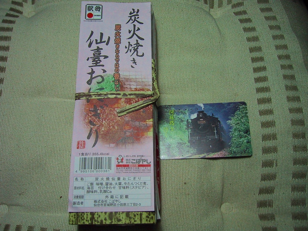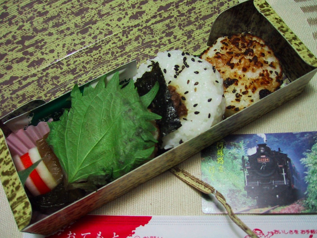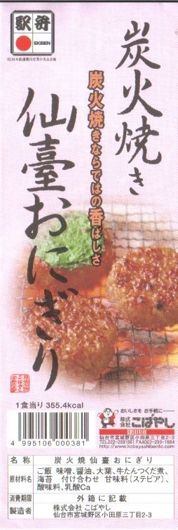 竹皮を模したボール紙製容器の中に、醤油を塗って焼いた普通の焼きおにぎり、牛タン入りおにぎり、シソの葉巻きおにぎりと円形のおにぎりが3つに漬物が入る。具がない、またはほとんどない握り飯で、焼きおにぎりはカリカリ感がまったくなく炭火焼特有の香りも感じられないが、飯の美味さで食が進むし、駅弁らしい包装に手を抜かずにこの低価格はなかなかのもの。2003年頃までの販売か。