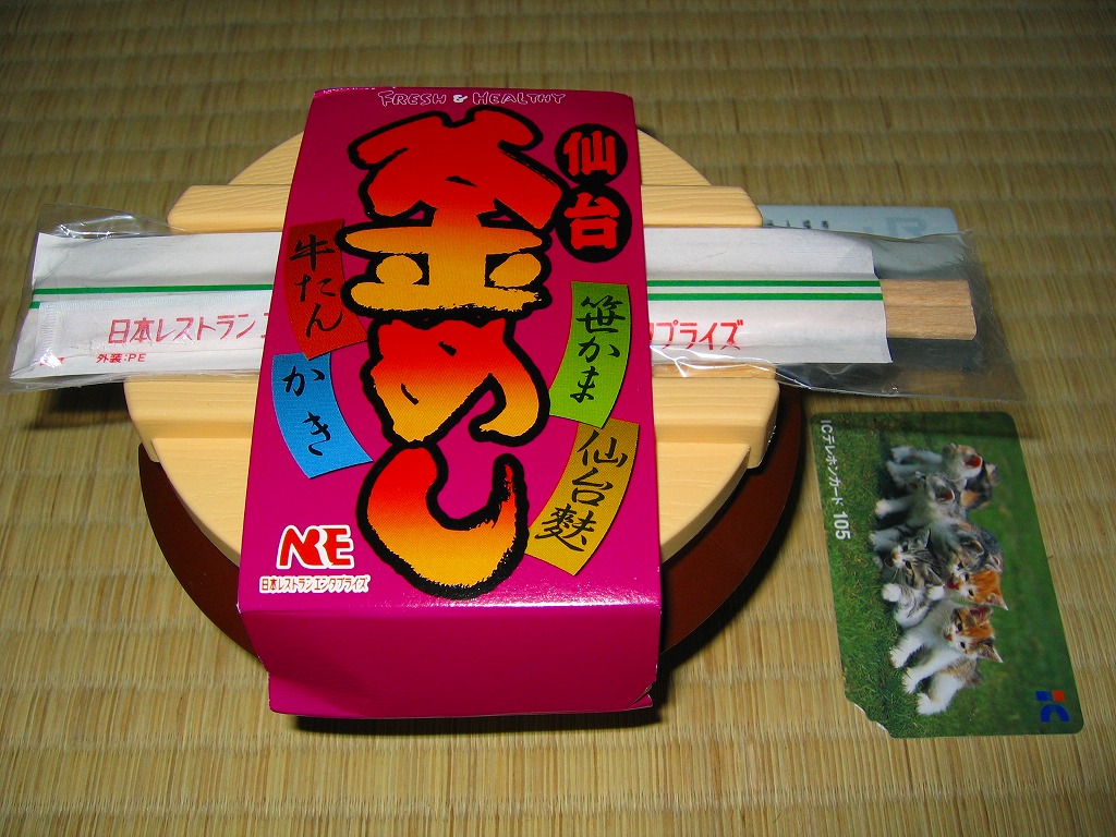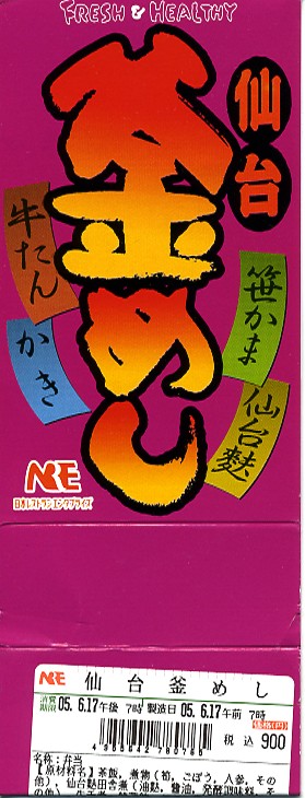 仙台駅の日本レストランエンタプライズの釜飯駅弁。商品名を書いたボール紙で封をした、オールプラスティック製の釜型容器の中に茶飯を詰めて、牛タン・煮カキ・笹蒲鉾・仙台麩などを載せる。米国産牛肉禁輸で以前のようにはいかない牛タンはともかく、仙台駅弁にしては全体的に風味が落ちるし価格も高いし、仙台名物をあれもこれもと欲張り過ぎた感はある。2005年頃までの販売か。