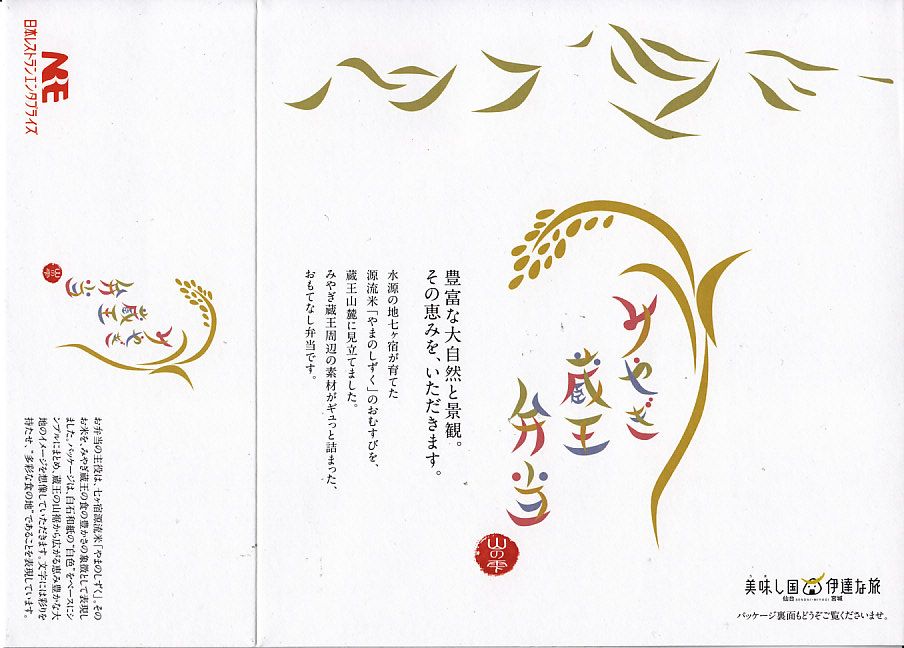 仙台・宮城観光キャンペーン推進協議会県南地域部会の企画により、2010(平成22)年11月30日に発売。正方形の容器に透明なふたをして、上面に稲穂をデザインし下面に観光案内を印刷した白いボール紙の枠にはめる。中身は塩むすび、梅むすび、きゃらぶきむすびという3種のおむすびと、豚肉衣焼、玉子焼、ダイコンやサトイモなどの煮物、白石温麺炒め、りんご果汁入りコンニャクゼリーなど。中身の詰め方にギッシリ感があり、食べて楽しくなる感じ。2014年頃までの販売か。