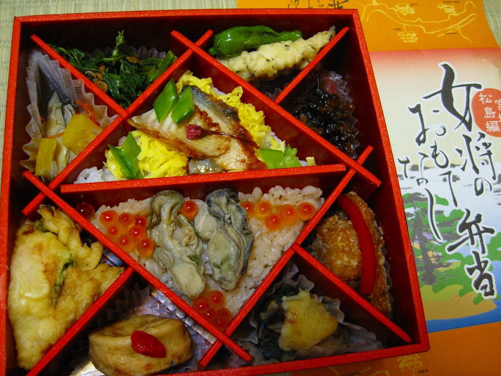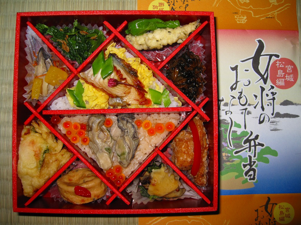 2007(平成19)年12月から仙台駅で展開される「女将のおもてなし弁当」シリーズの第2弾として、2008(平成20)年4月1日に発売。黒塗りの容器を、松島を描いた掛紙で包む。中身は細かく10区画に区切られ、中央の2区画はウナギ御飯とカキ御飯、周囲の8区画はおかずなどで、アカモク唐揚とししとう、アサリと海苔の佃煮、マグロ竜田揚、カキとほうれん草のゆず味噌田楽、がんもどき、小エビとアサリのかき揚げ、カキのマリネ、菜の花と小エビのおひたし。