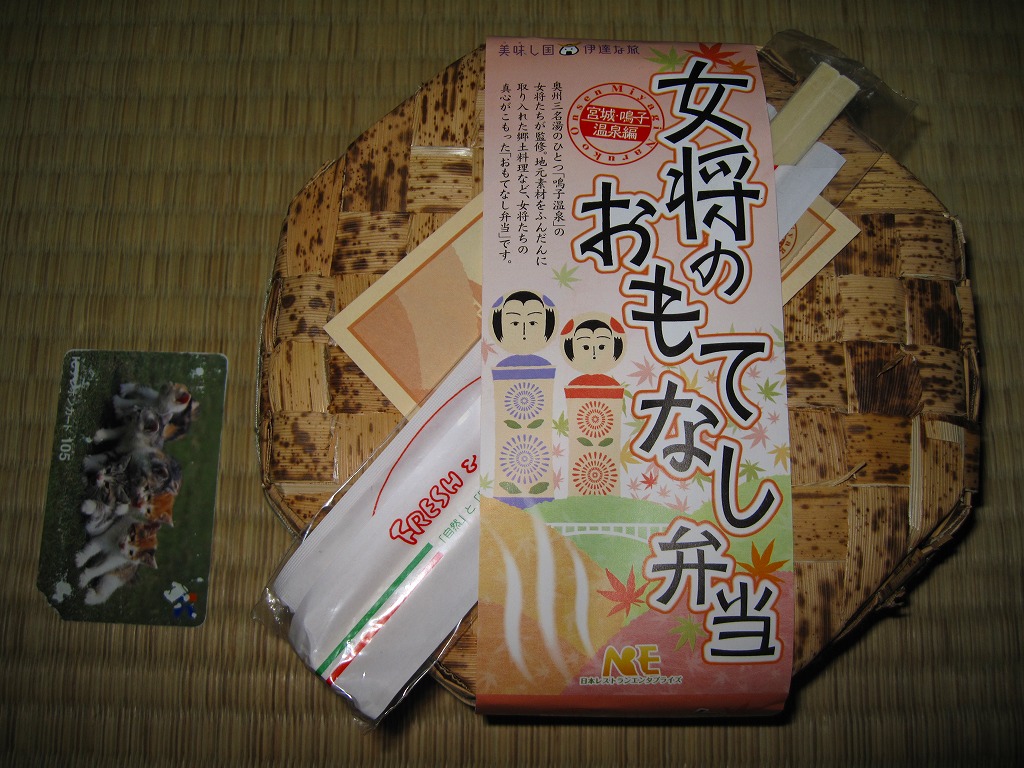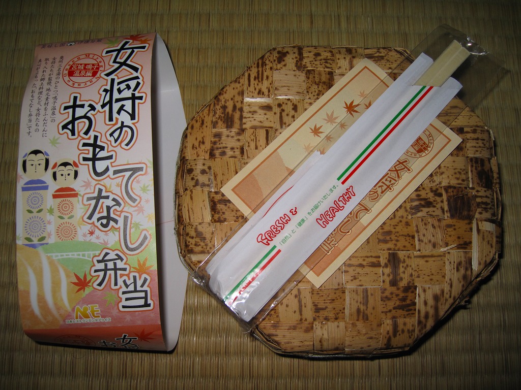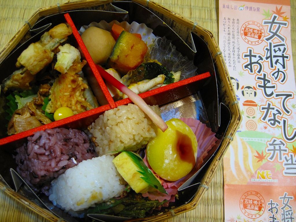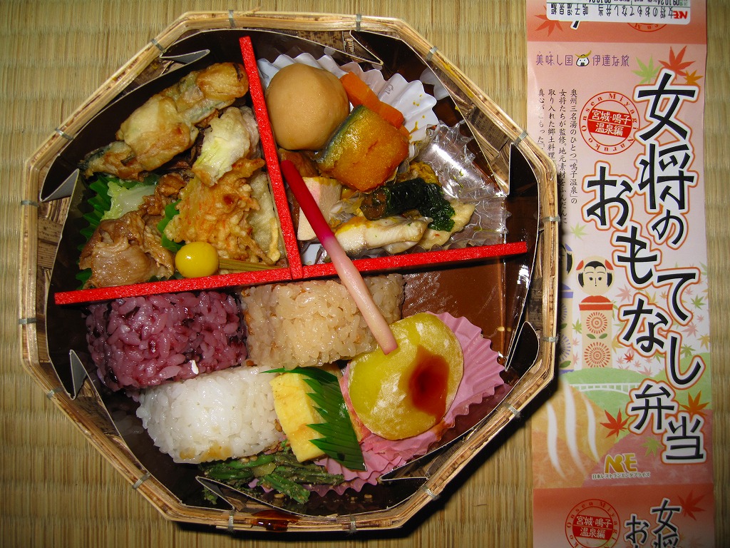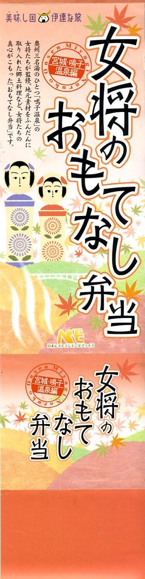 2007(平成19)年12月から仙台駅で展開される「女将のおもてなし弁当」シリーズの第3弾として、2008(平成20)年10月1日に3か月間の期間限定駅弁として発売。竹皮編みの正八角形の容器を使用、商品名と鳴子エリアを思わせる渓谷やこけしなどの絵柄を印刷した紙帯で留める。