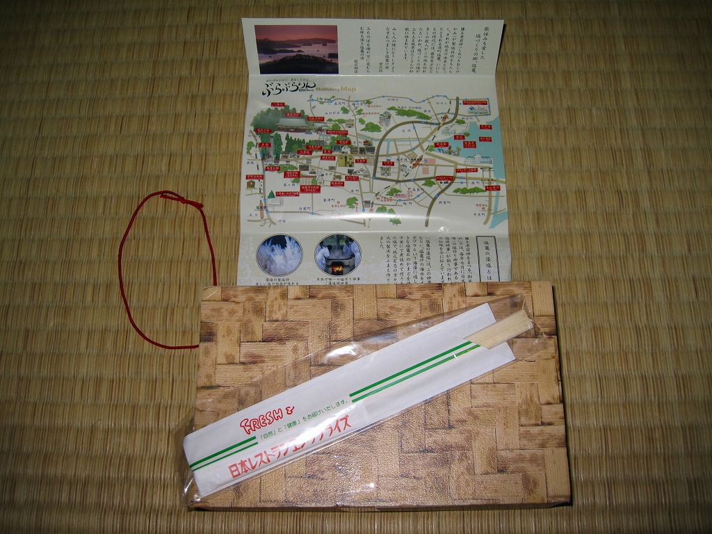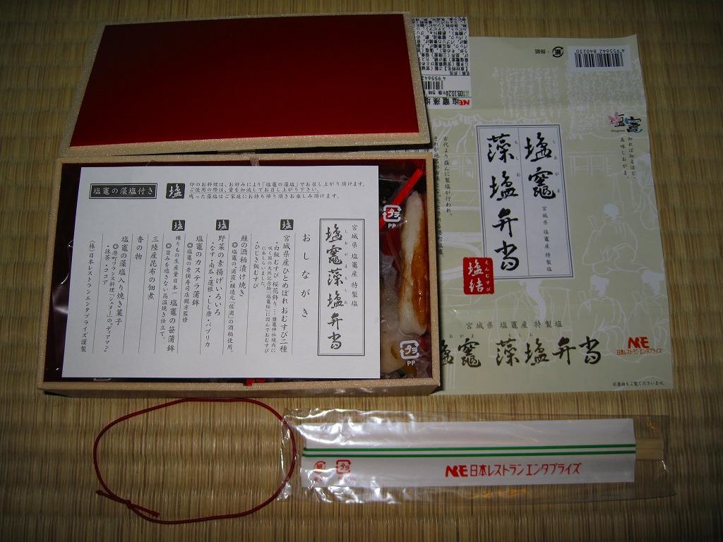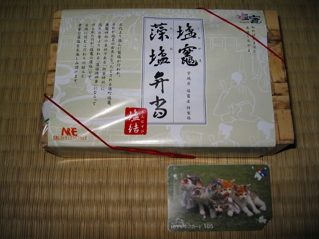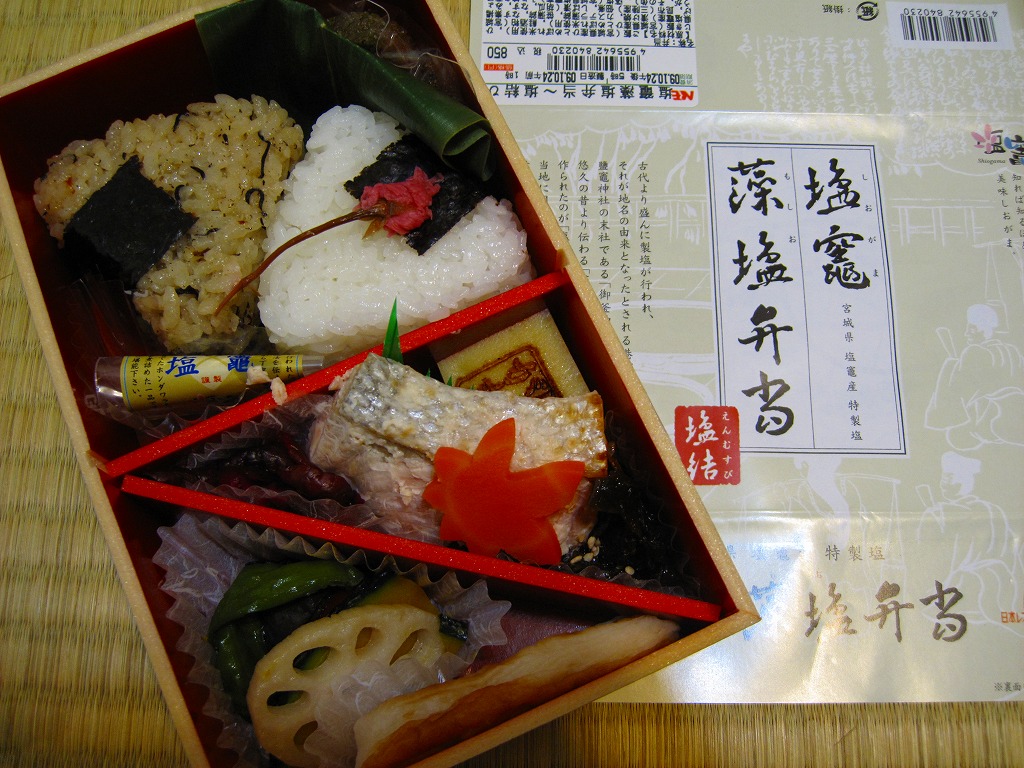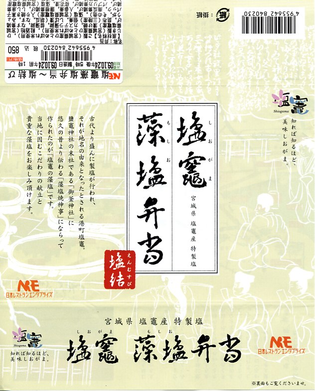 塩釜(しおがま)商工会議所の「塩竈(しおがま)みなとブランド推進委員会」とNREが共同で開発し、2009(平成21)年10月1日から12月31日まで仙台駅と東京駅と新幹線の車内で販売された期間限定駅弁。竹皮編みの柄を印刷した容器に、表面に商品名と宣伝文を、裏面に塩釜の市街地の観光地図を描いた掛紙をかけて、ゴムで留める。
