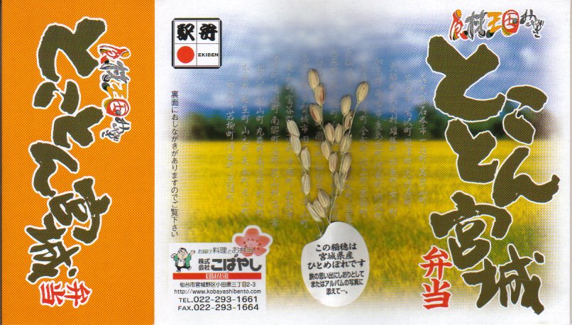 宮城県の食関連産業振興キャンペーン「食材王国みやぎ」の実施に伴い、2003(平成15)年7月1日から8月31日まで販売した期間限定駅弁。精米後の米粒を模した容器を、輪ゴムで留めてボール紙の枠をはめる。その底面にお品書き付き。
