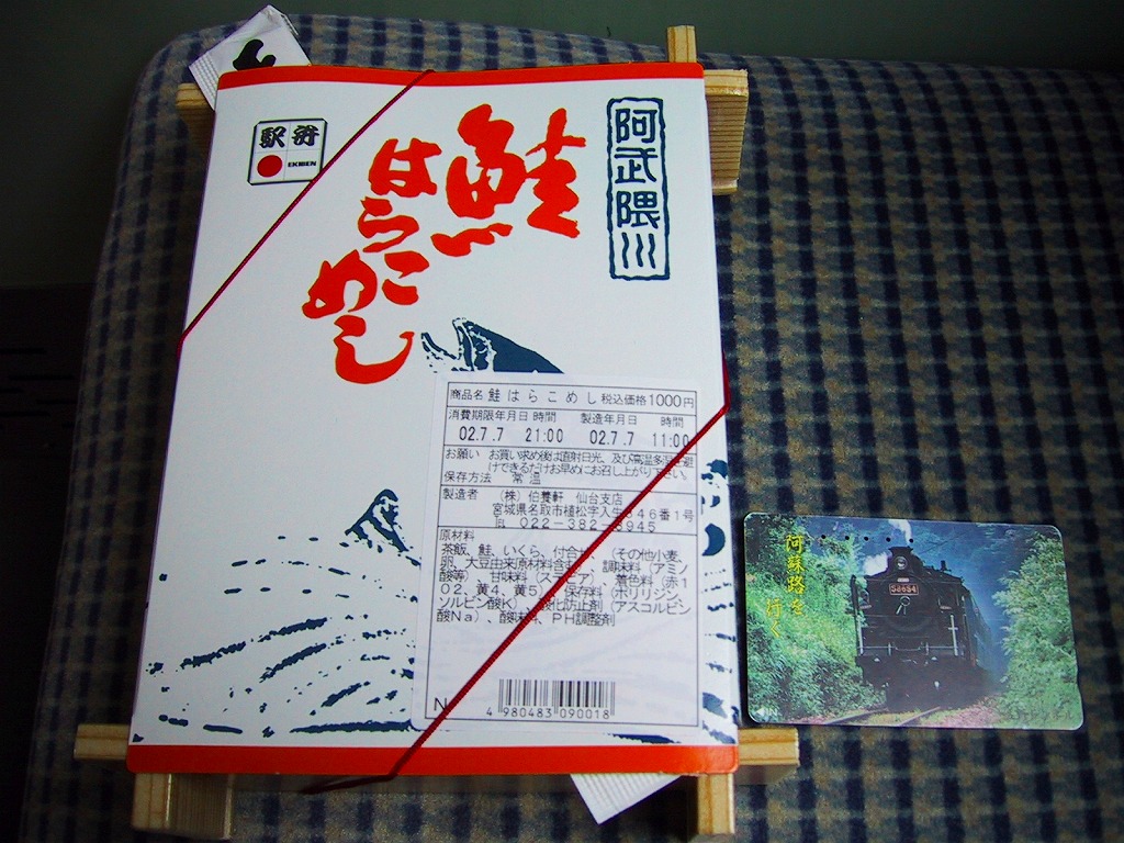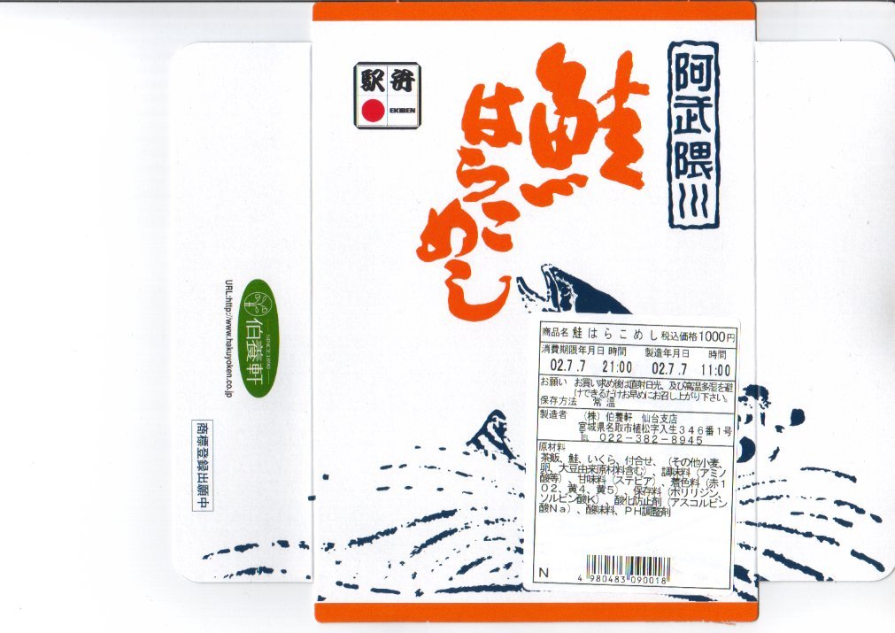 上記の駅弁「鮭はらこめし」の、2002(平成14)年時点での姿。1982年の発売から四半世紀、その姿を変えなかった。東北地方の他の駅でも同種の駅弁を、「阿武隈川」のかわりに「北上川」や「南部」を冠して販売した。