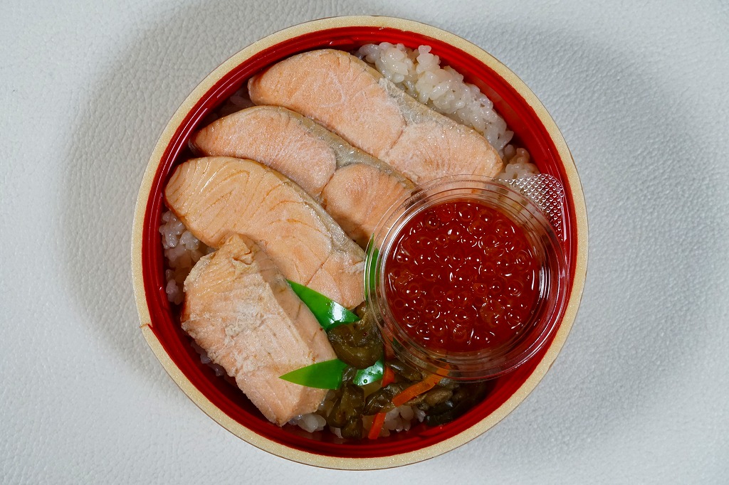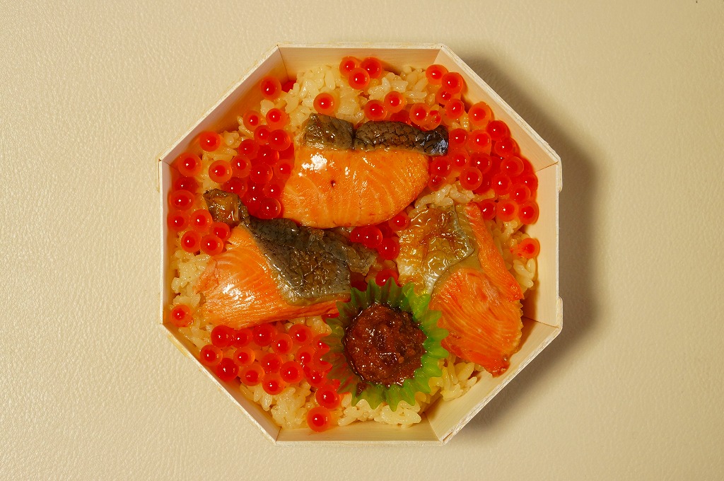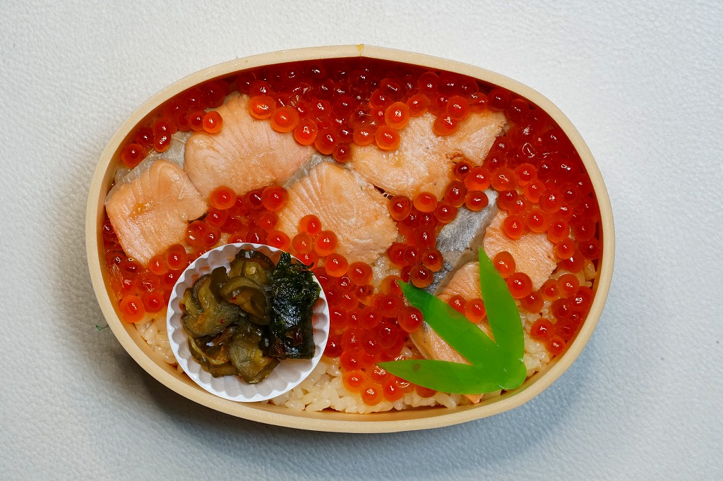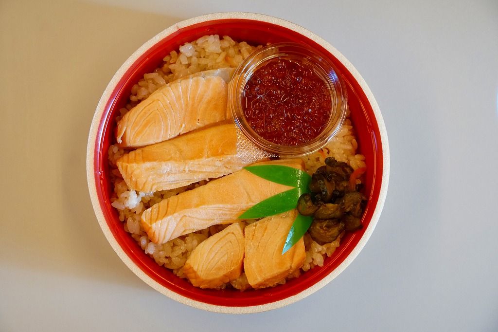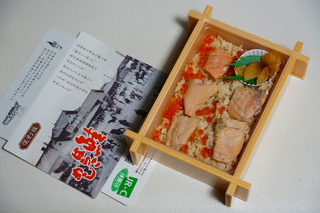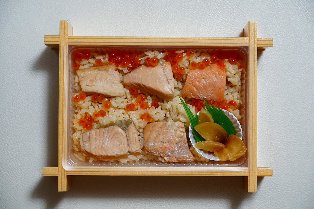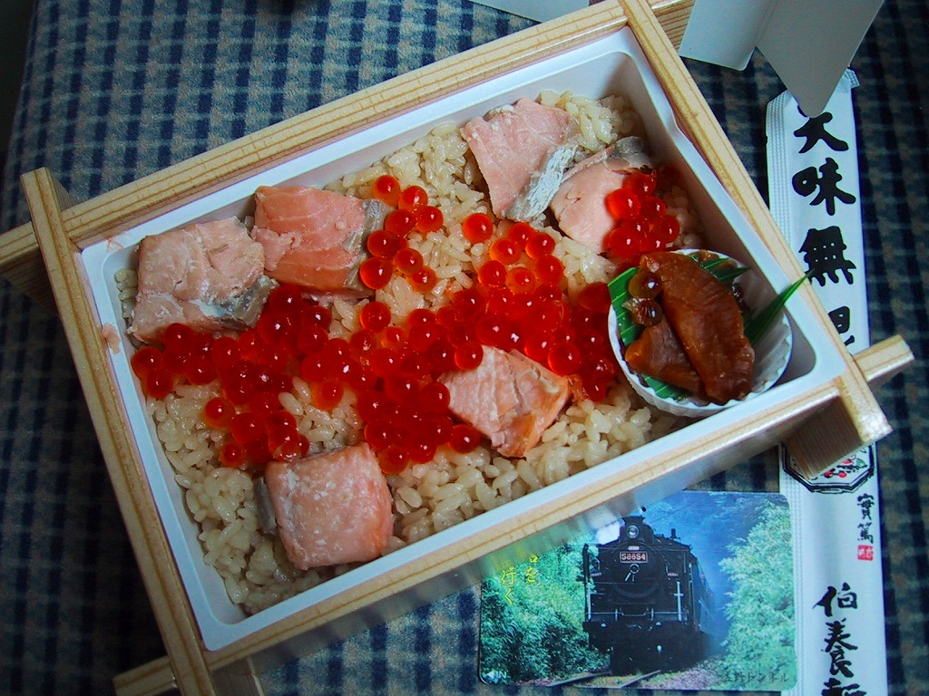 茶飯とイクラは普通の風味も、鮭が妙にポソポソしており、そこだけ例えば東京駅冷凍輸入駅弁「O−bento」当初版の味。現地でもそうならば、仙台駅弁3社中3番手の評価になりそう。加熱機能付き容器版もあるそうだが、イクラを暖めるのはよくない。2009年頃までの販売か。