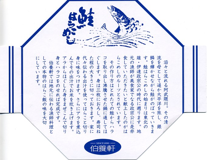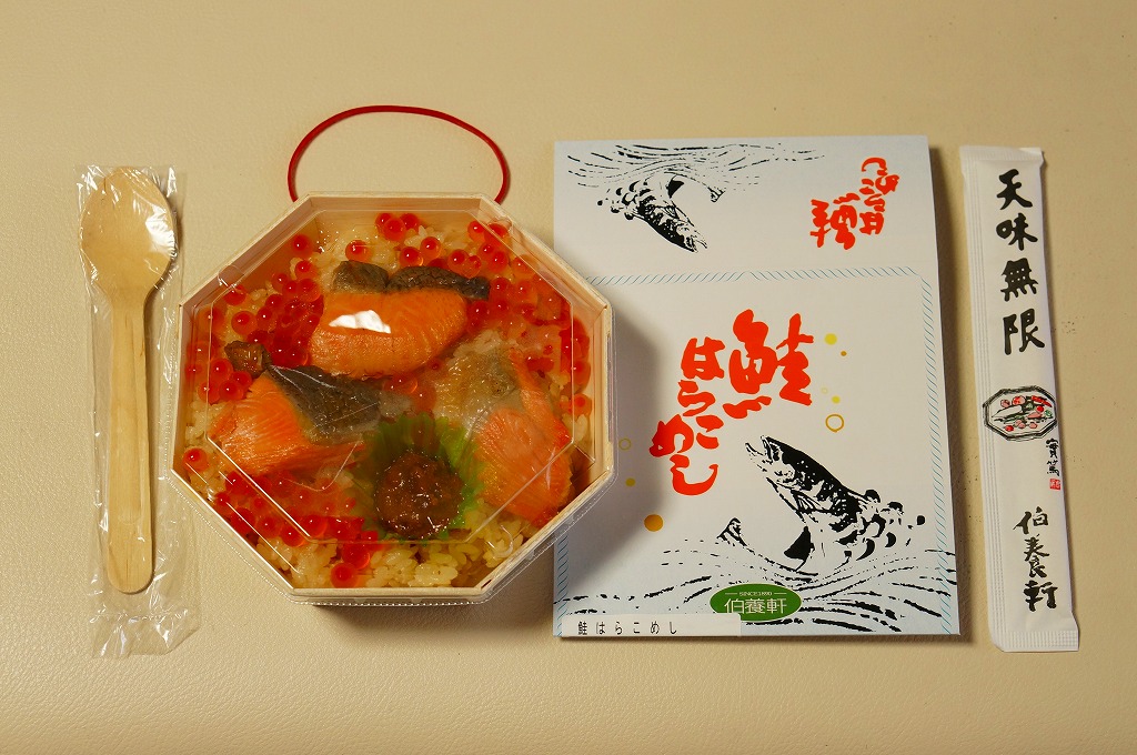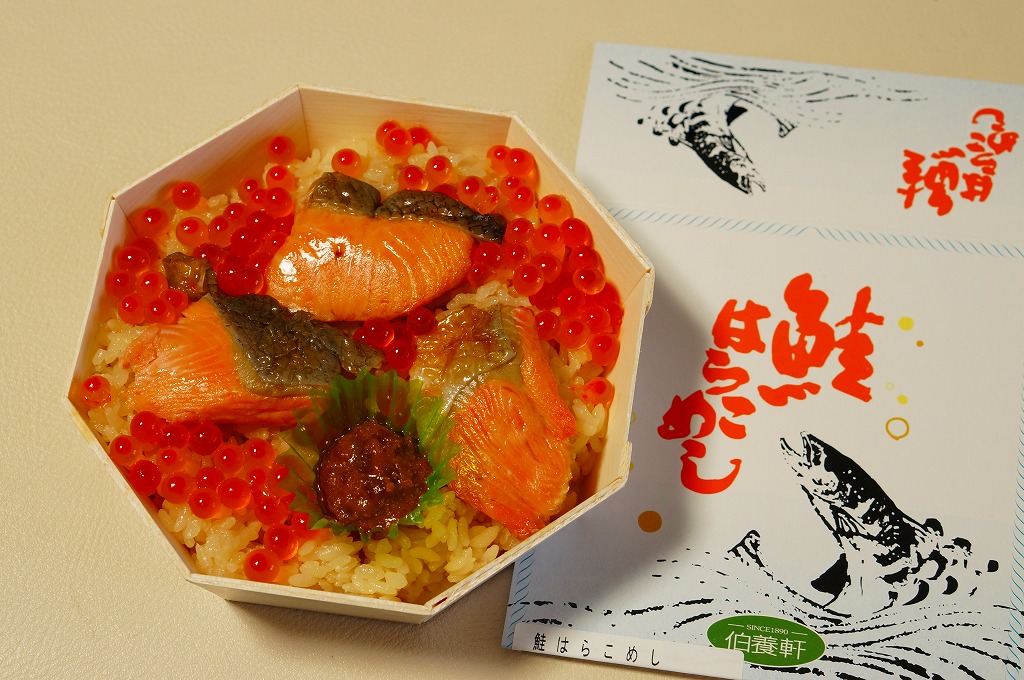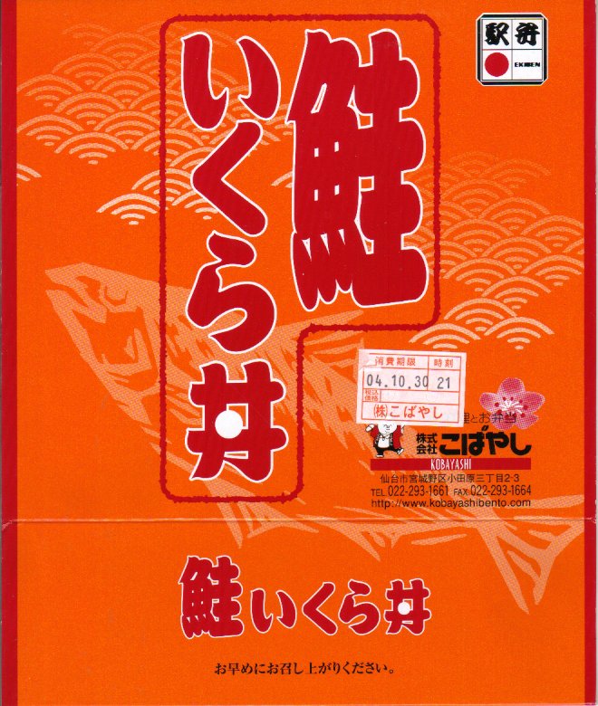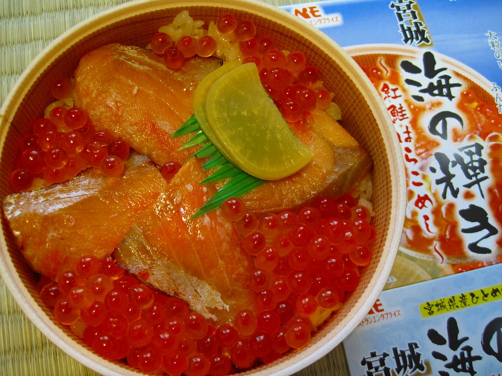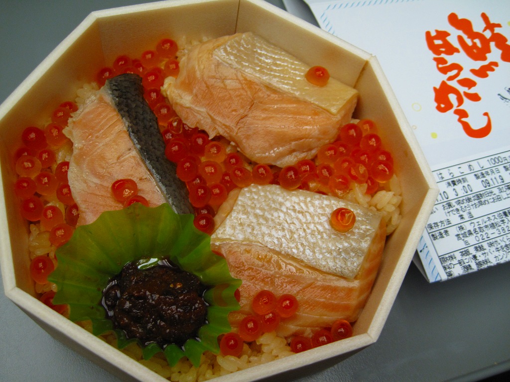 正六角形の容器をボール紙のパッケージに収める。中身は白御飯の上にイクラを敷いて、残りの部分に錦糸卵を敷いてから鮭をペタペタと載せたもの。見た目も味も駅弁の名前どおりで、品質はさすがの仙台駅弁。中身も価格もライバル業者の「鮭はらこめし」への対抗駅弁か。2005年頃までの販売か。