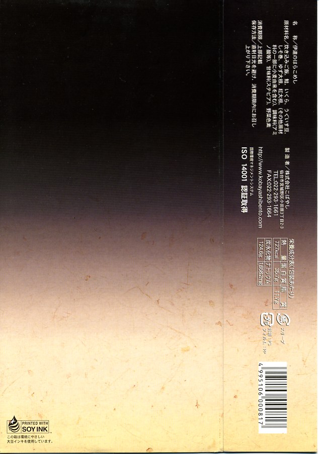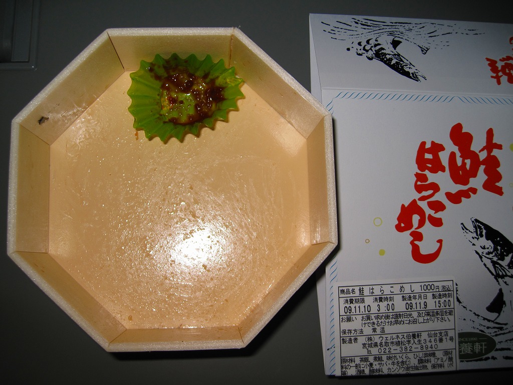 2009(平成21)年11月9日に購入した、仙台駅弁のパッケージ。味や中身は上記の2015年のものと変わらないが、当時は中身にふたがあり、そこに鮭はらこめしの解説文が掲載されていた。なお、底面の「新古川」駅は古川の誤記である。