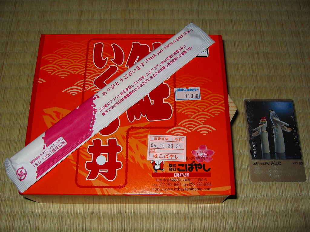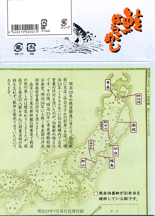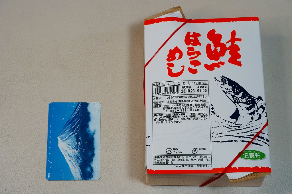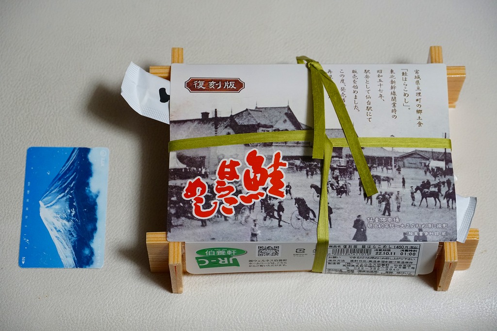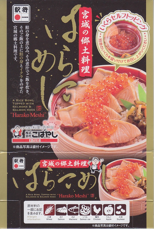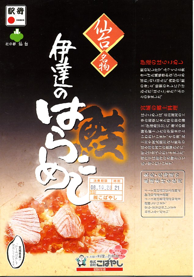 2005(平成17)年8月に発売か。長方形の黒い容器に同色同素材のふたをして輪ゴムで留め、中身イメージ写真を載せた紙枠にはめる。中身は仙台駅弁名物の鮭はらこめし。味噌しそ巻、うぐいす豆、ゆず大根、紅大根が付け合わせ。