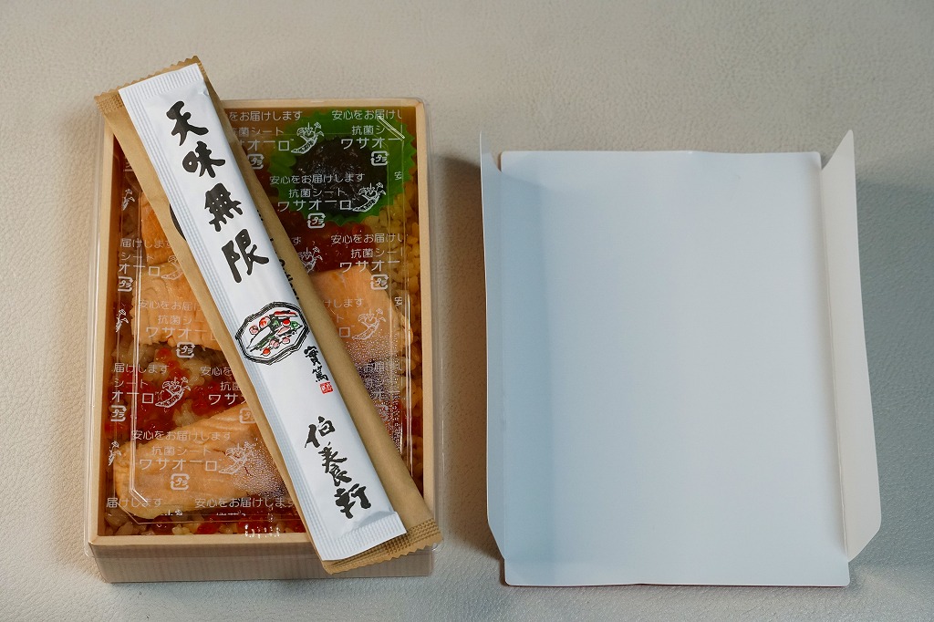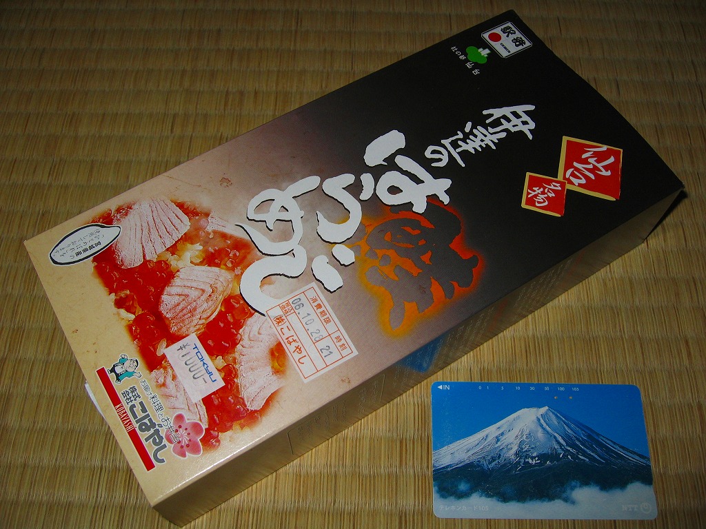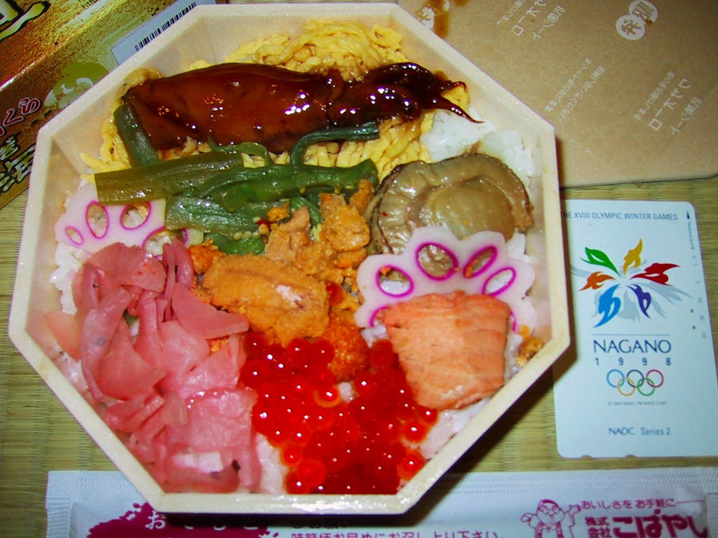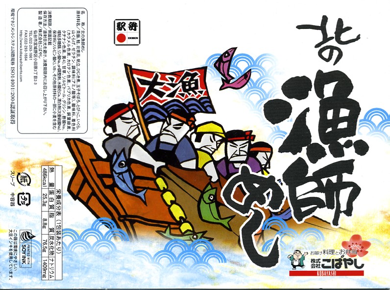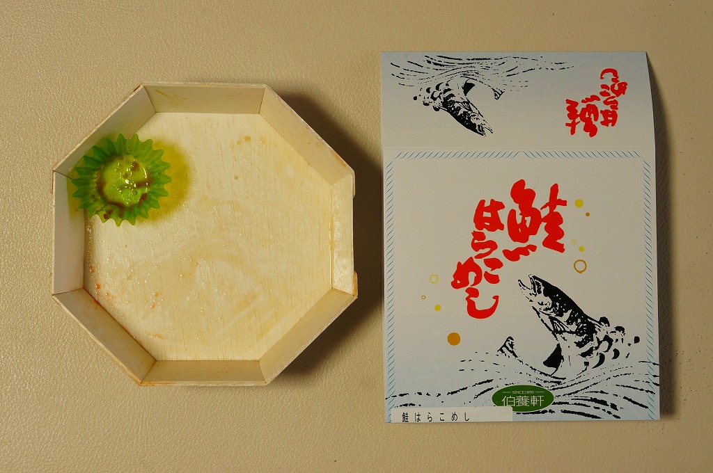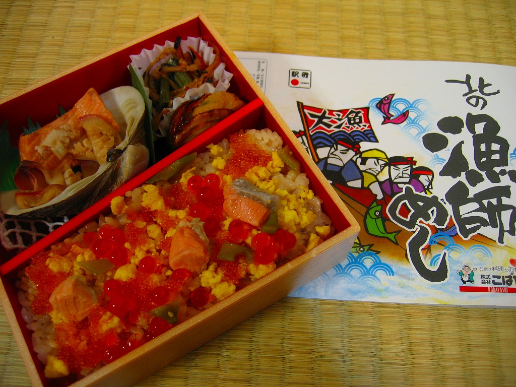 2008(平成20)年の秋に発売か。正方形の小さな容器に透明なふたをして、小舟の漁師を切り絵風に描いたボール紙の枠にはめる。中身はシャケ、イクラ、とびっこ、玉子そぼろ、山くらげを散らす茶飯に、貝殻に収めた鮭味噌焼とホッキ貝に、ホタテとひじき煮を添えるもの。