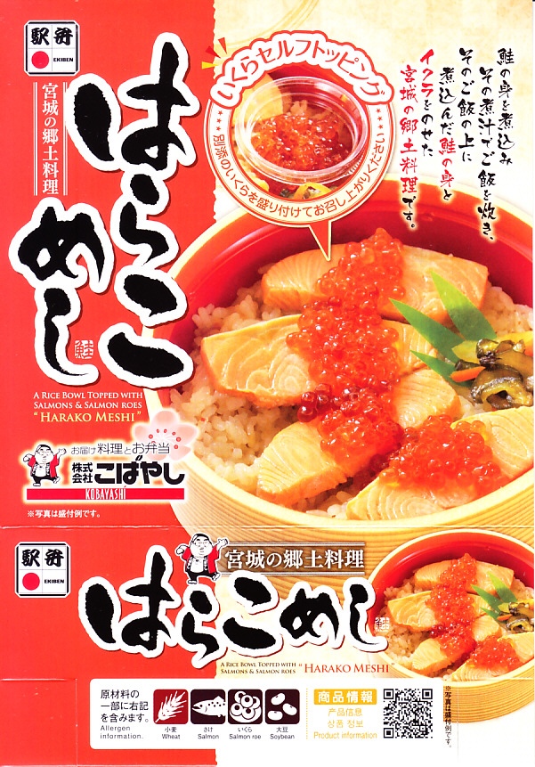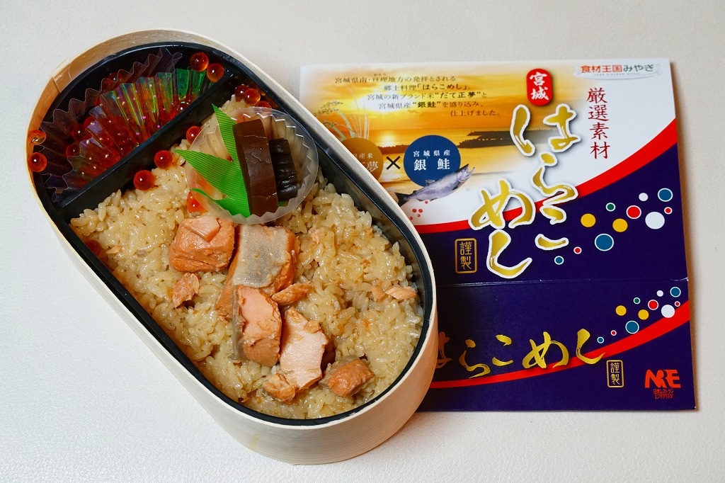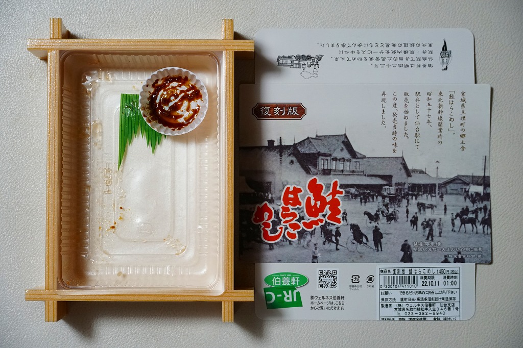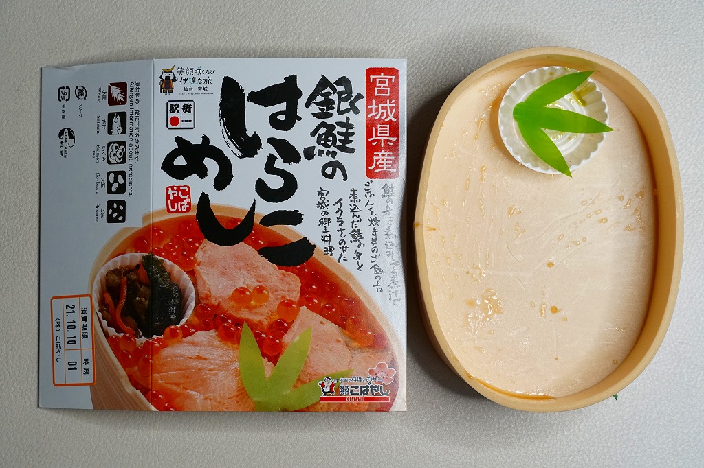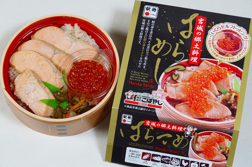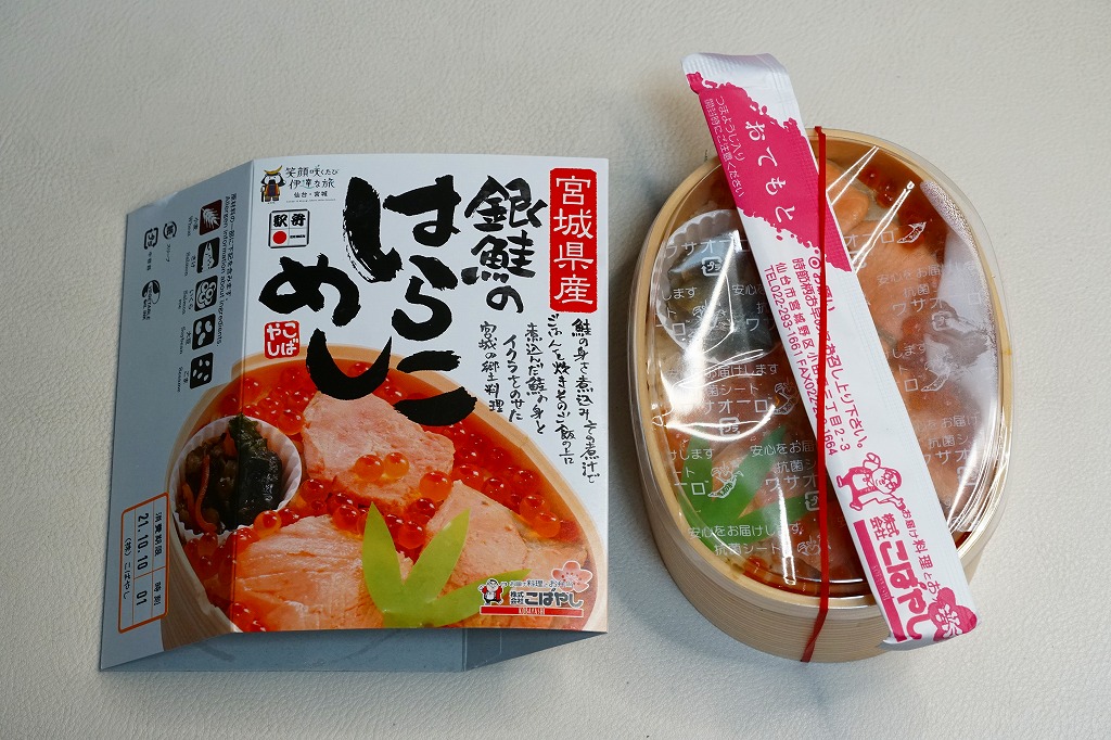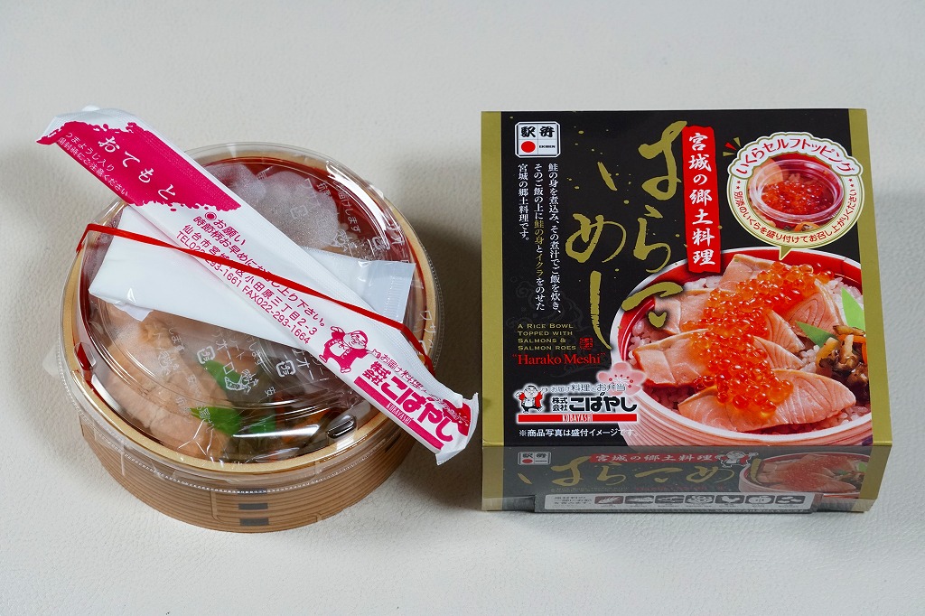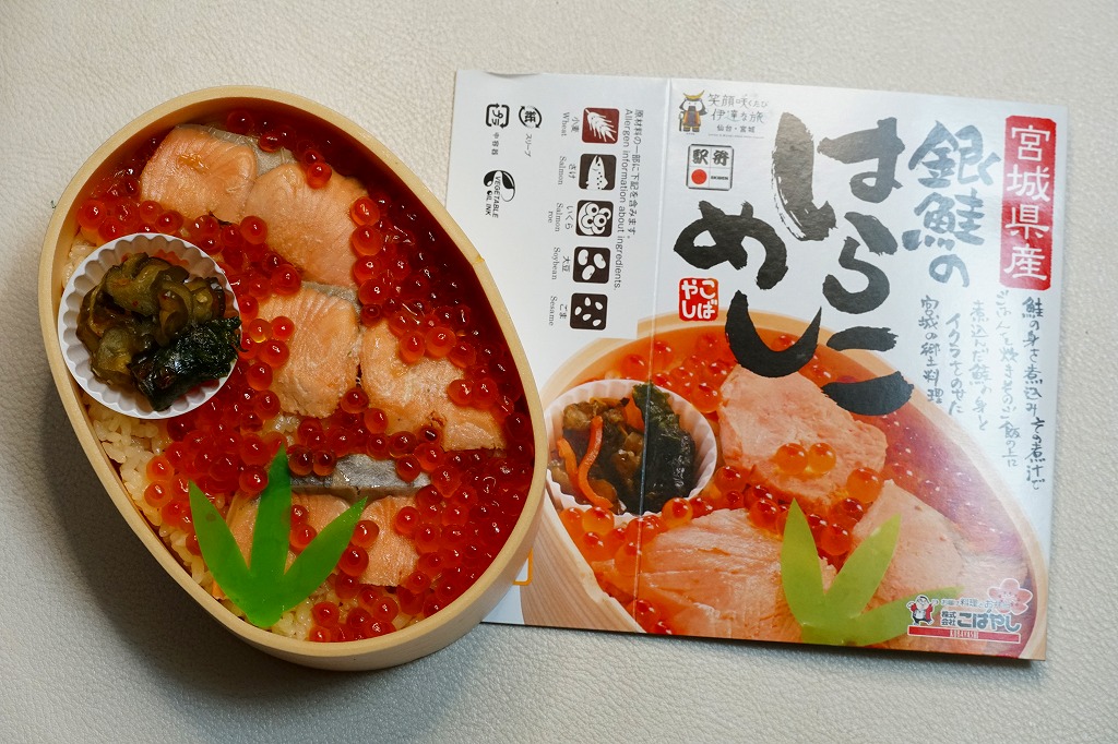 2020(令和2)年の8月に発売か。この調製元では約10年ぶりの鮭はらこめし駅弁かもしれない。楕円形のような容器に茶飯を詰め、サケの煮物とイクラの醤油漬で覆い、万来漬を添える。宮城県や亘理町の郷土料理に由来する鮭はらこめしの駅弁として、基本に忠実な内容と見た目どおりの味を持つため、駅弁売店の運営元がちゃんとこれを発注するのであれば、きっと長く売られる駅弁になると思う。価格は2020年の発売時や2021年の購入時で1,250円、2021年12月のリニューアルで1,300円、2023年時点で1,350円、2024年時点で1,580円。7月の「宮城の郷土料理はらこめし」へのリニューアルで終売。