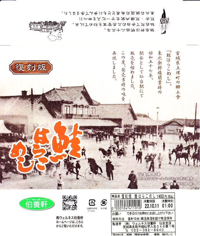 井形の発泡材容器に半透明のプラ製トレーを仕込み、茶飯を詰め、鮭を並べ、はらこ(イクラ)を散らし、大根の味噌漬けを添える。この容器の構造と中身で、1982(昭和57)年の仙台駅弁「鮭はらこめし」の発売当時の姿、2009年までの姿を再現した。紙のふたの絵柄は当時とは違い、1910年代と思われる仙台駅舎の写真を使用。2000年代まで仙台駅や盛岡駅や、東北新幹線の主な駅で買えた、少し懐かしい、今ほどみずみずしくはない味が、再現されたように思えた。仙台駅では通常版の「鮭はらこめし」も併売された。この復刻版は11月までの開催期間中と翌年の会期後販売の際に販売された。