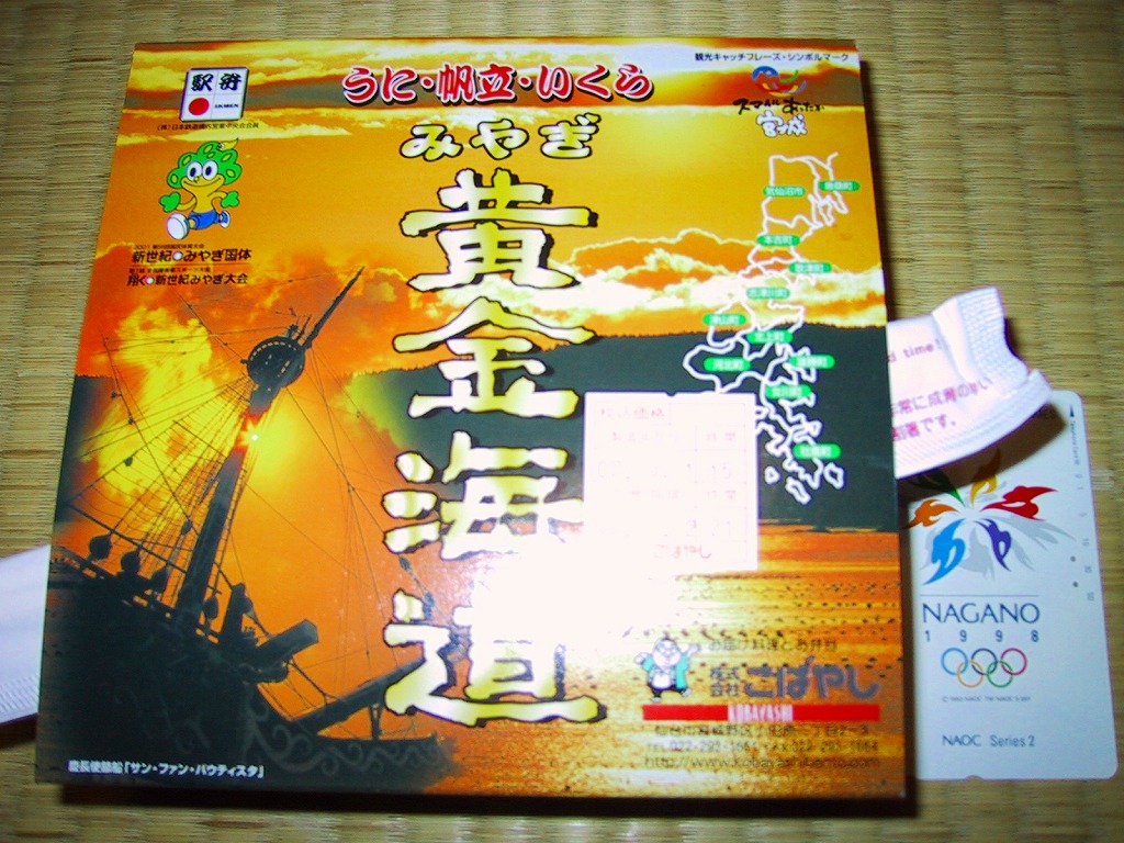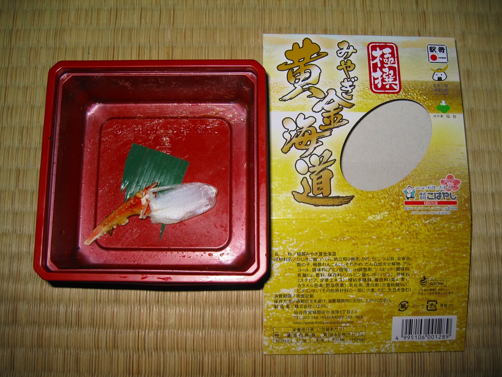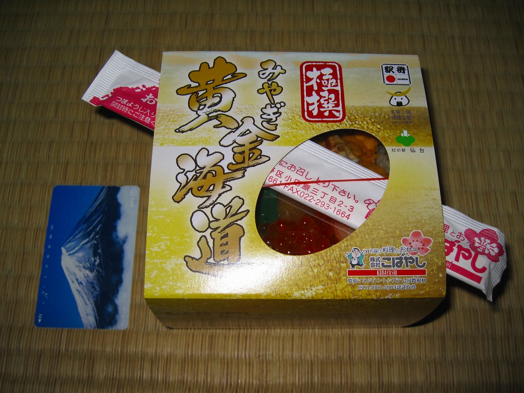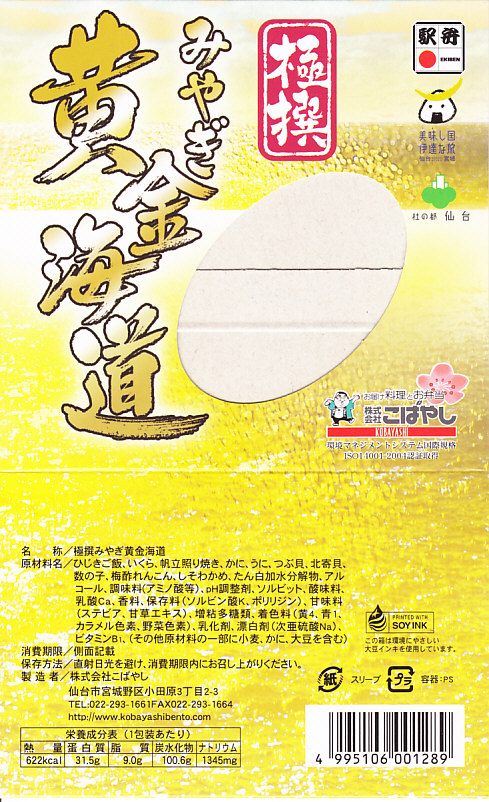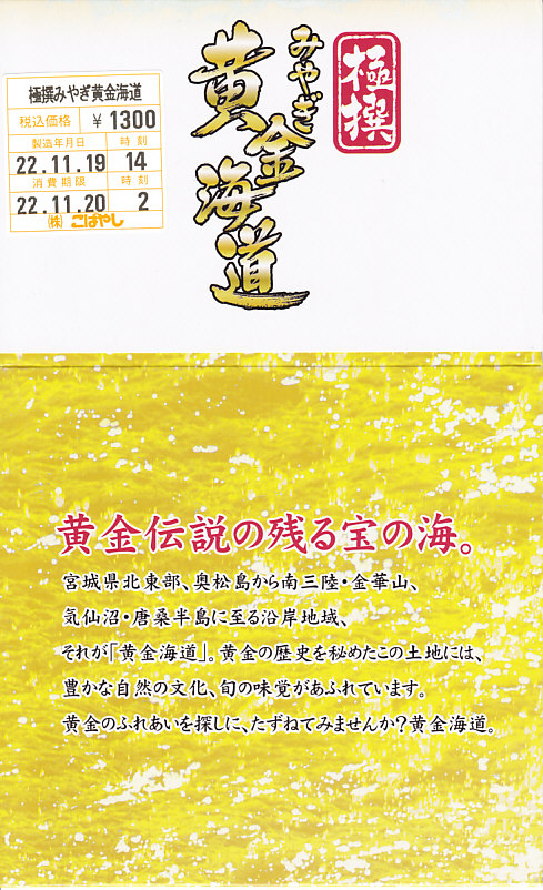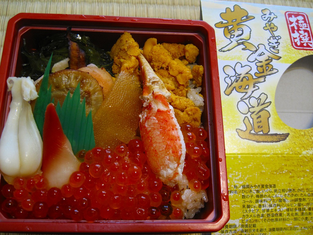 2000(平成12)年8月に仙台駅で発売。八角形で柔らかめの容器を、ボール紙製パッケージに押し込む。中身は御飯の上にうに・帆立・いくらのパッケージ記載食材とともに、やりいか姿煮・山くらげ・錦糸卵・焼鮭と、なぜかたっぷりの紅生姜を載せる、パッケージも容器も中身も見た目に豪華で華やかな駅弁。仙台の駅弁なので味もしっかりしている。パッケージの底には黄金海道の由来を記載。価格は2002年の購入時で1,000円、2014年2月から1,050円、2017年時点で名前が「新みやぎ三陸黄金海道」になり、2022年に終売か。