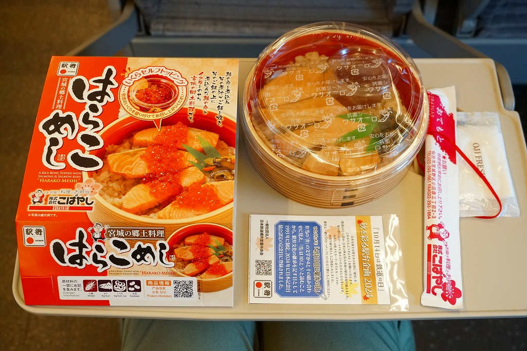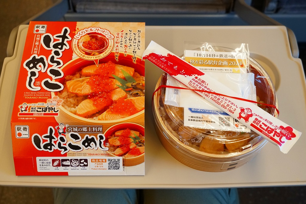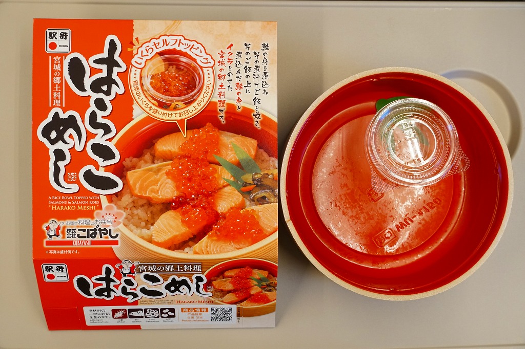 2009(平成21)年の末頃に、下記の駅弁「紅鮭はらこめし」をリニューアルか。円形の容器を、中身の写真を美しく印刷したボール紙の枠にはめる。中身は鮭風味飯なる茶飯の上を、レアに焼いた紅鮭漬け焼と輝くイクラ醤油漬で覆い、ダイコンの味噌漬けを添えるもの。東北地方っぽい塩辛さがうまい。価格は2010年の購入時で1,000円、2017年時点で1,100円、2018年時点で1,150円、2020年時点で1,200円。日本レストランエンタプライズ(NRE)改めJR東日本フーズ改めJR東日本クロスステーションは、2022年9月に仙台調理センターを廃止したため、この駅弁もそれまでに終売か。