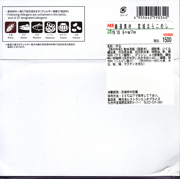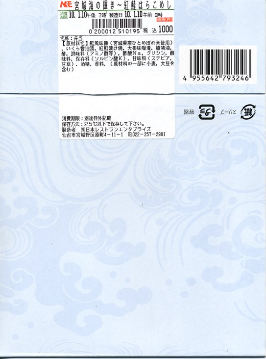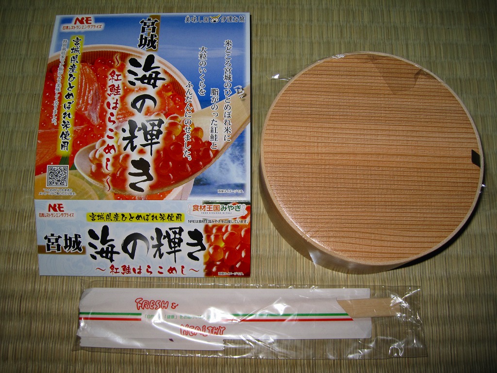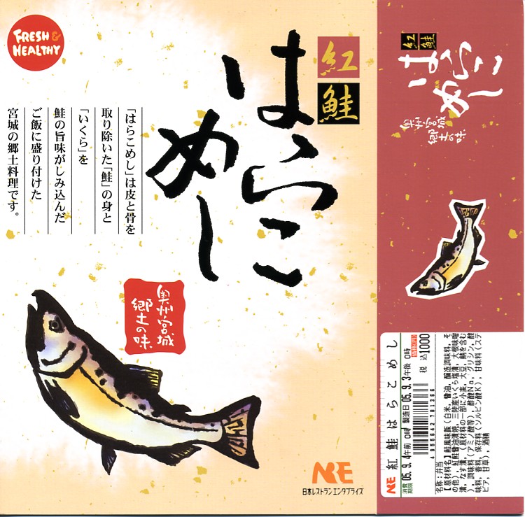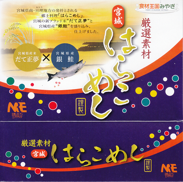 仙台駅弁伯養軒の代表商品「鮭はらこめし」のNRE版。小判型容器を、駅弁の名前や鮭や宣伝文句を描いたボール紙の枠にはめる。中身はまんまの鮭はらこめし。鮭風味の茶飯の上に鮭とイクラを少々載せる。