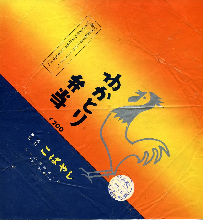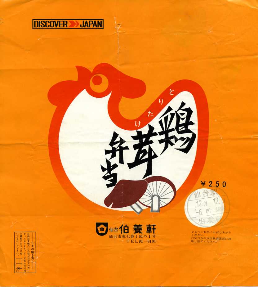 1960年代の調製と思われる、昔の仙台駅弁の掛紙。ニワトリに見える絵柄で中身を想像できると思うが、仙台で鶏を「かしわ」と呼んで、わかってもらえたのだろうか。この名前の仙台駅弁は1990年代まで存続し、今は分かりやすく「とりめし」。