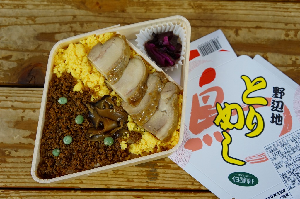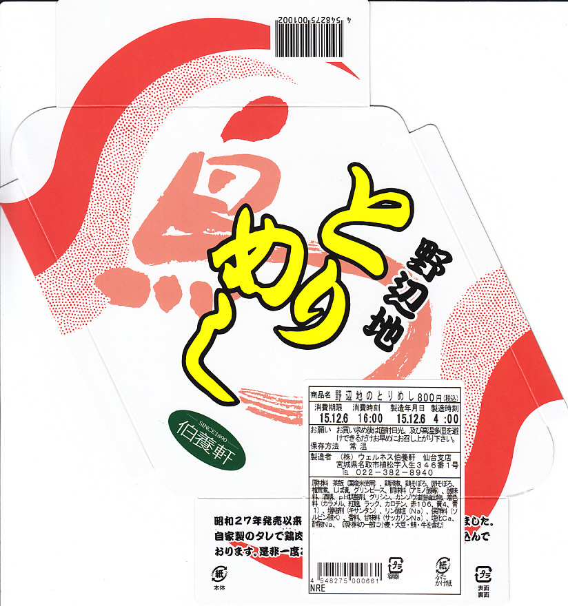青森県の東北本線野辺地駅で1952(昭和27)年に発売し、長らく名物の駅弁であった「とりめし」が、仙台駅の駅弁になったもの。かつての調製元である伯養軒が、仙台や盛岡や野辺地や青森に支店を持ち、それぞれで違う名前や意匠で同じような鶏飯駅弁を販売していたものを、おそらく2015(平成27)年に仙台駅と青森駅(盛岡駅でも販売)でブランドを同じくしたとみられる。