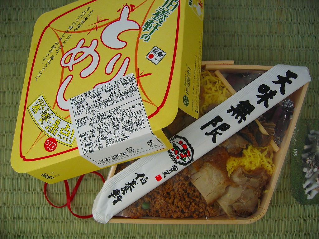 菱形の容器に掛紙代わりの紙のふたをかけて輪ゴムでしばる。中身は茶飯の上に鶏そぼろや錦糸卵を敷き鶏照焼をたっぷり載せる、駅弁の名前どおりの鶏飯。国鉄時代に有名だった青森県野辺地駅のとりめしと中身が同じなのではと思うが、仙台も野辺地も同じ伯養軒なので良いのだろう。味もとても良い。