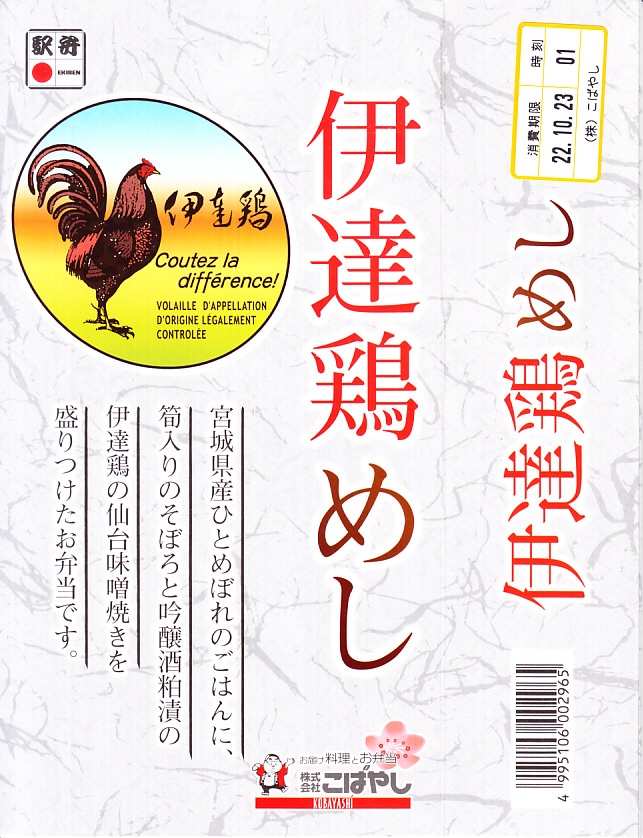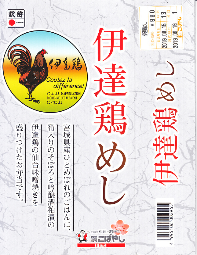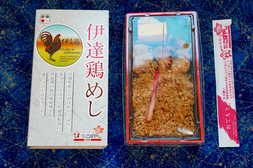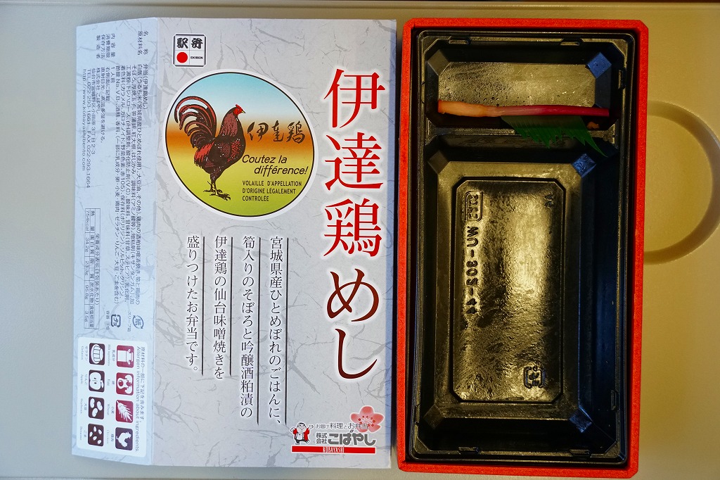2018(平成30)年2月に仙台駅で発売か。白飯をタケノコ入りの鶏そぼろと鶏肉の酒粕味噌漬焼で覆い、はじかみで彩り、玉子焼、笹かまぼこ、紅大根を添える。御飯に宮城県産ひとめぼれを、肉に福島県の伊達物産のブランド鶏「伊達鶏」を使うという。食べれば普通の鶏飯駅弁も、その味は上質。価格は2018年の発売時や2019年の購入時で980円、2022年6月から1,080円。