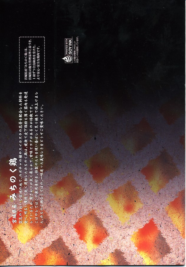 パッケージ側面に解説がある「みちのく鶏」。宮城県の平成ファーム宮城事業所が生んだ銘柄鶏を、2001年親会社の丸紅畜産が会社ごと吸収、そしてその主要顧客の生活協同組合が同社了解のもと、同じレベルの他社品もこれを名乗らせている模様。宮城の鶏なのに岩手産や青森産があるのはそのため。カボチャやスイカズラを食べさせていることよりはむしろ、安全や安心にかなり気を配っていることを売りにする。
