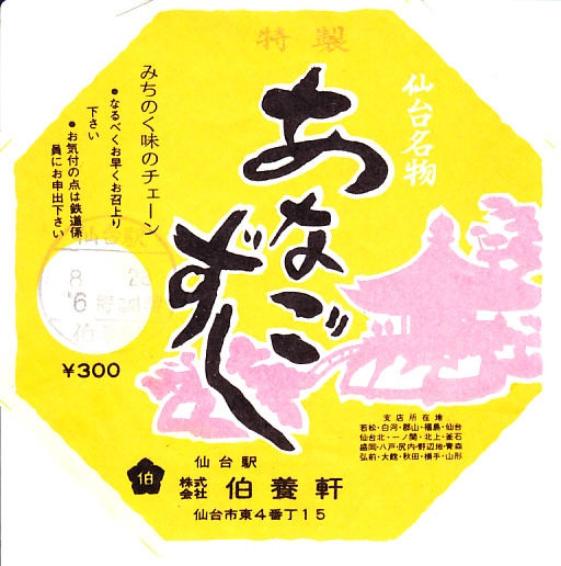 これは盛岡駅伝統の駅弁と思いきや、現物に盛岡の文字がなく製造者が伯養軒の仙台支店なので、ここでは仙台駅弁として収蔵するが、実は巨大な食品表示ラベルの下に「盛岡 味の伯養軒」の印刷が隠れている。「三陸」の地域名は、宮城県エリアの陸前と岩手県エリアの陸中と青森県エリアの陸奥を示すから、つまり仙台でも盛岡も青森でもウソにならず、この地域一帯を支配する調製元にとって便利な名称か。