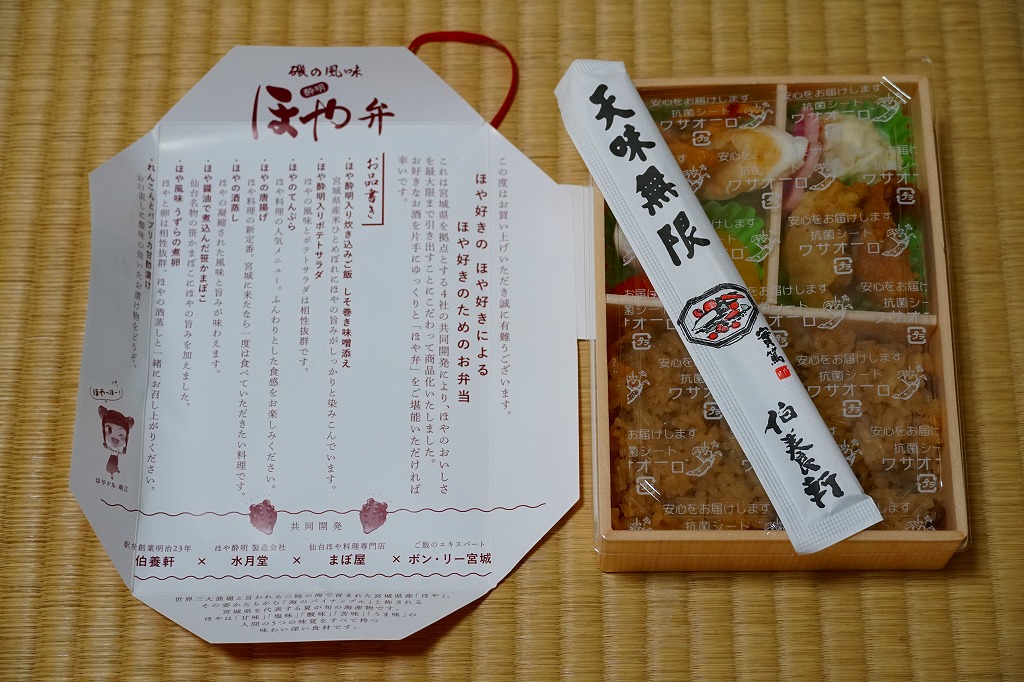 中身は掛紙裏面のお品書きのとおり、ほや酔明入り炊き込みご飯としそ巻き味噌、ほや酔明入りポテトサラダ、ほやのてんぷら、ほやの唐揚げ、ほやの酒蒸し、ほや醤油で煮込んだ笹かまぼこ、ほや風味うずらの煮卵、れんこんとパプリカ甘酢漬け。どこからどこまでも逃げられないホヤづくし。小柄で高価な駅弁ではある。2024年夏頃までの販売か。