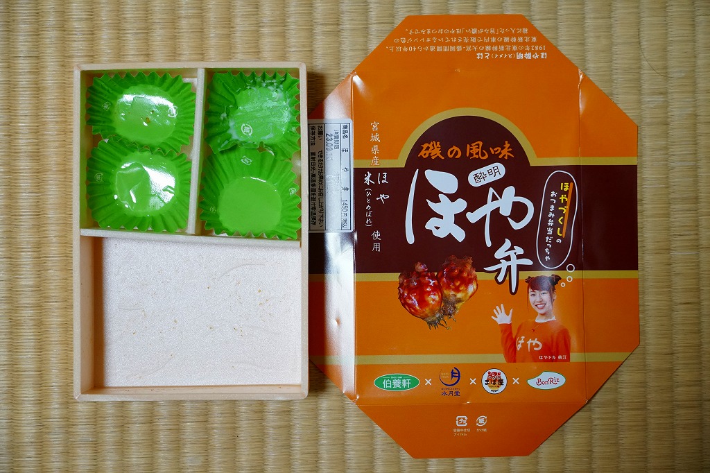 中身はホヤの炊き込み御飯のおにぎり。ホヤの産地でなく首都圏で製造された食品ではあるが、味は上記の現地での駅弁と変わらず、ホヤガイと称される貝のような臭みあるいは固さ、あるいは鮮度が落ちると出てくるという苦みや渋みないし金属臭もしくはガソリン臭のない、たとえればウニ飯を淡泊にしたようなもの。これで東京の市民にホヤをアピールできただろうか。価格は現地版が200円、この催事版が220円。