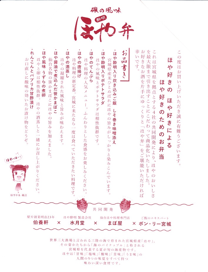 2023(令和5)年9月1日に仙台駅で発売、10月から東京駅などでも販売。東北新幹線の車内販売で親しまれたおつまみ「ほや酔明」が、41年の時を経て弁当になった。その小箱と同じオレンジ色と絵柄をした掛紙には、ほやドルなる女性の写真も載った。仙台駅弁のウェルネス伯養軒、ほや酔明の水月堂、ホヤ料理専門店のまぼ屋、ほや酔明おにぎりを持つ米飯事業会社BonRizが弁当の開発に携わったそうで、その4社のロゴマークも載る。ロゴのないJR東日本クロスステーションリテールカンパニー仙台支店も開発者だという。