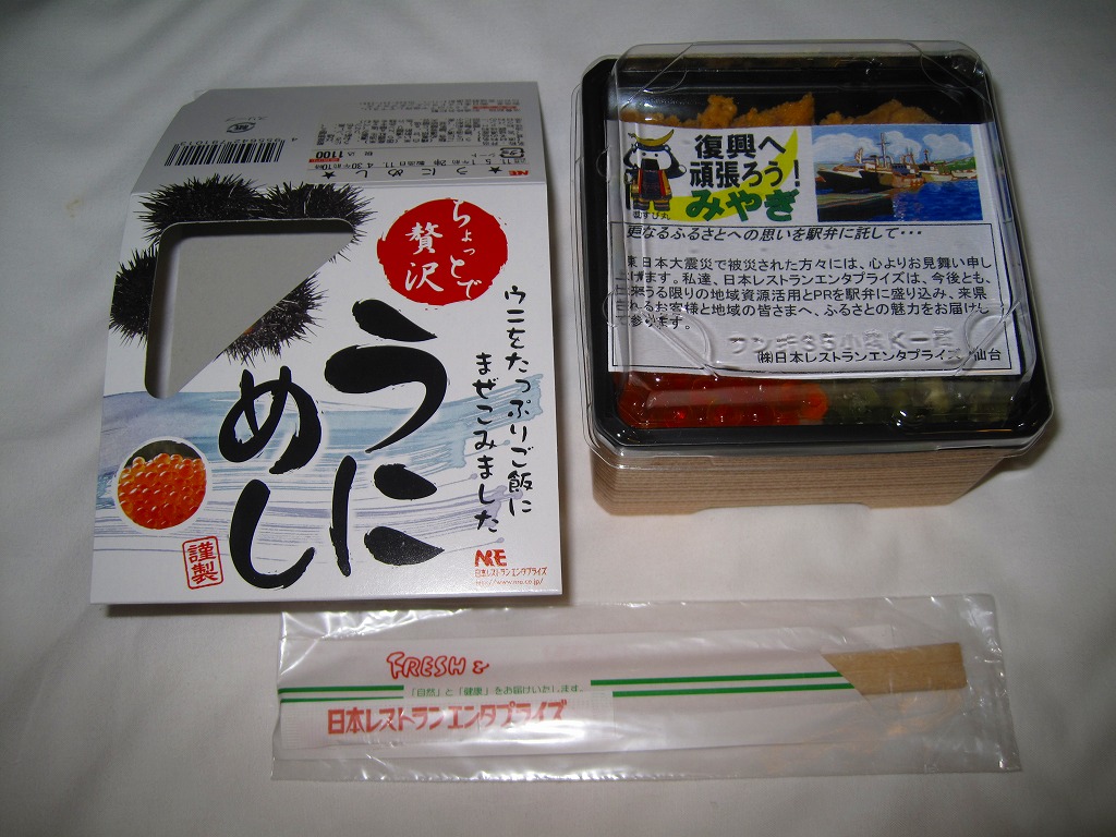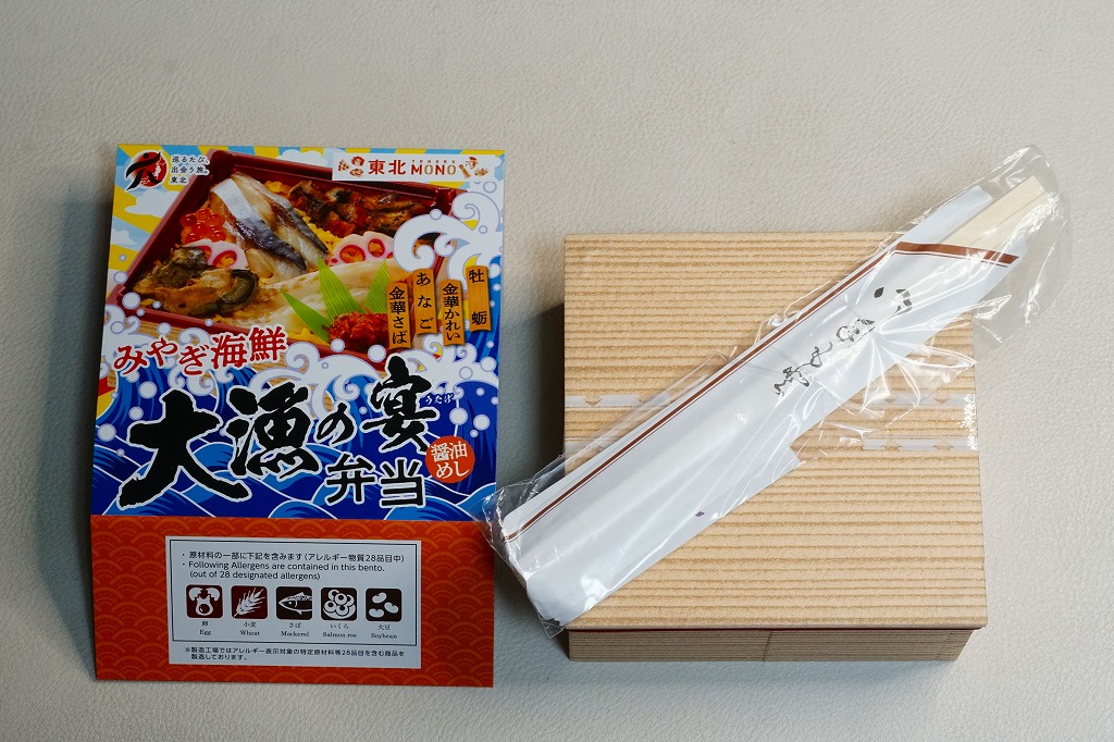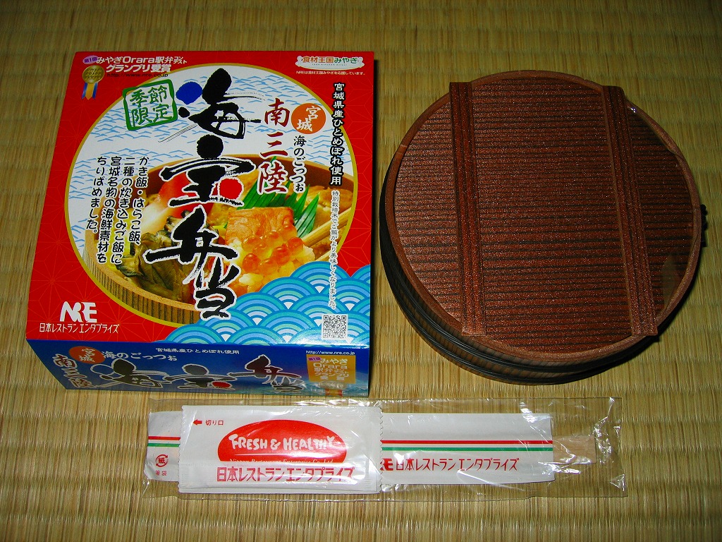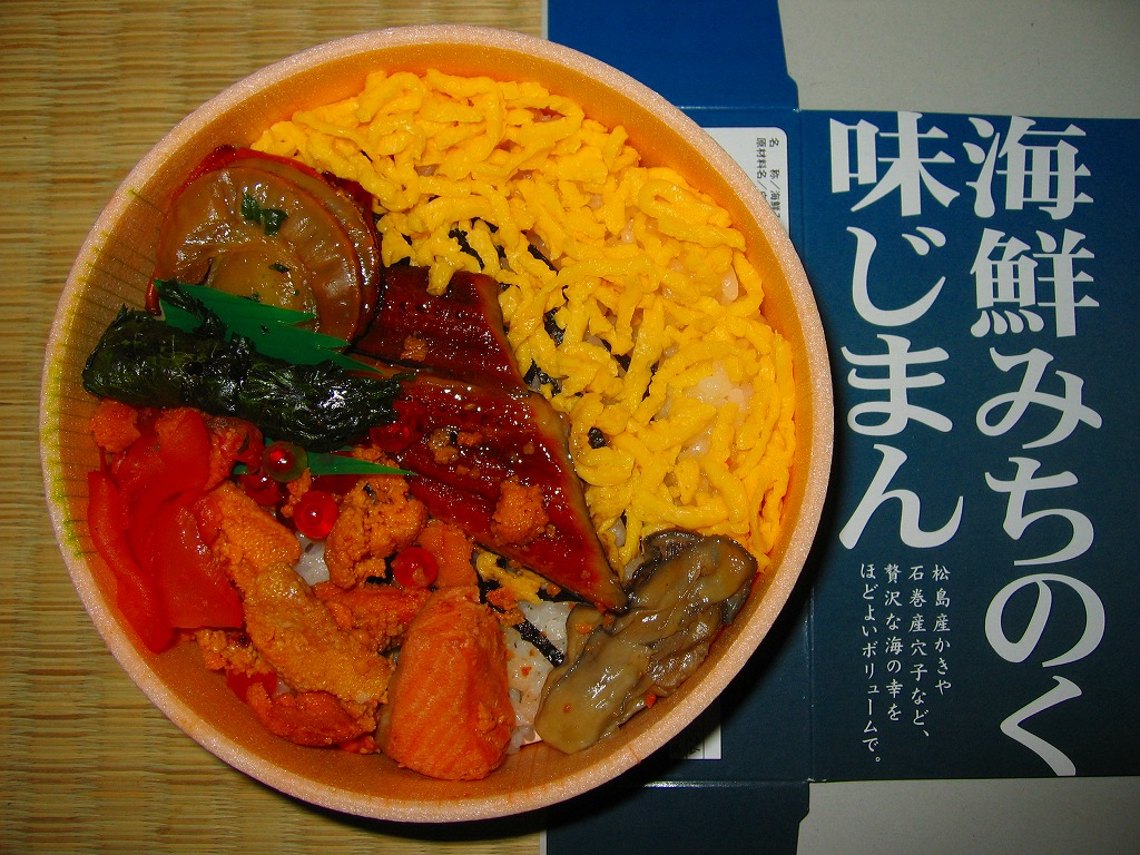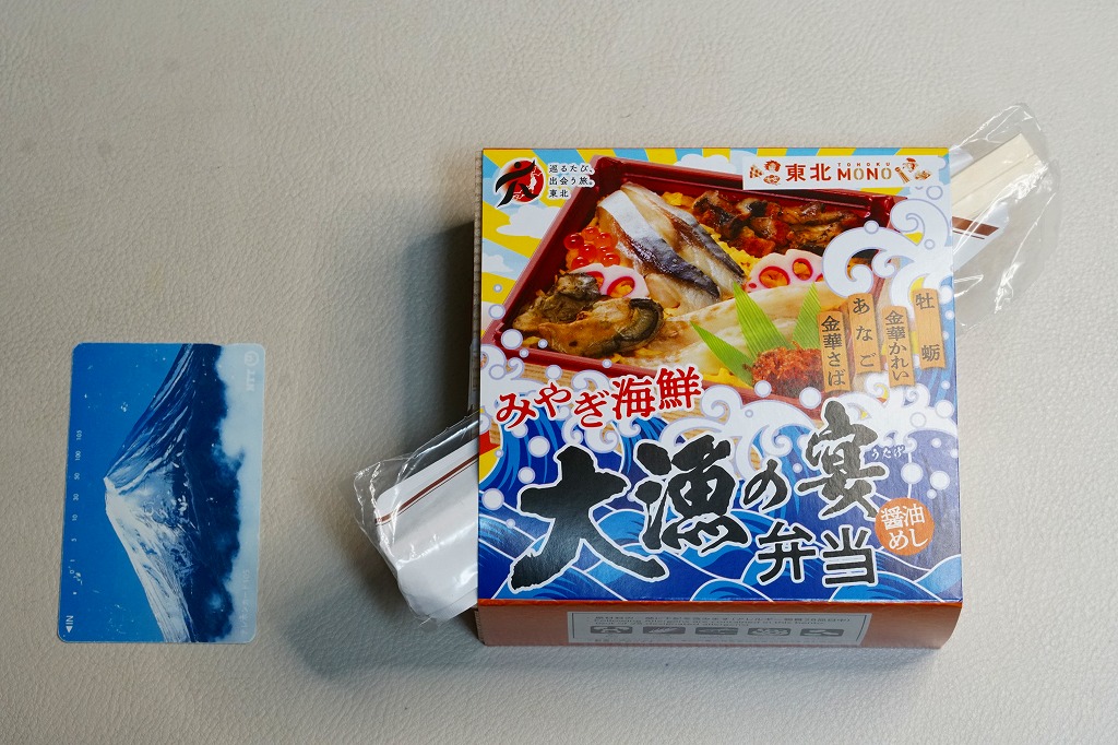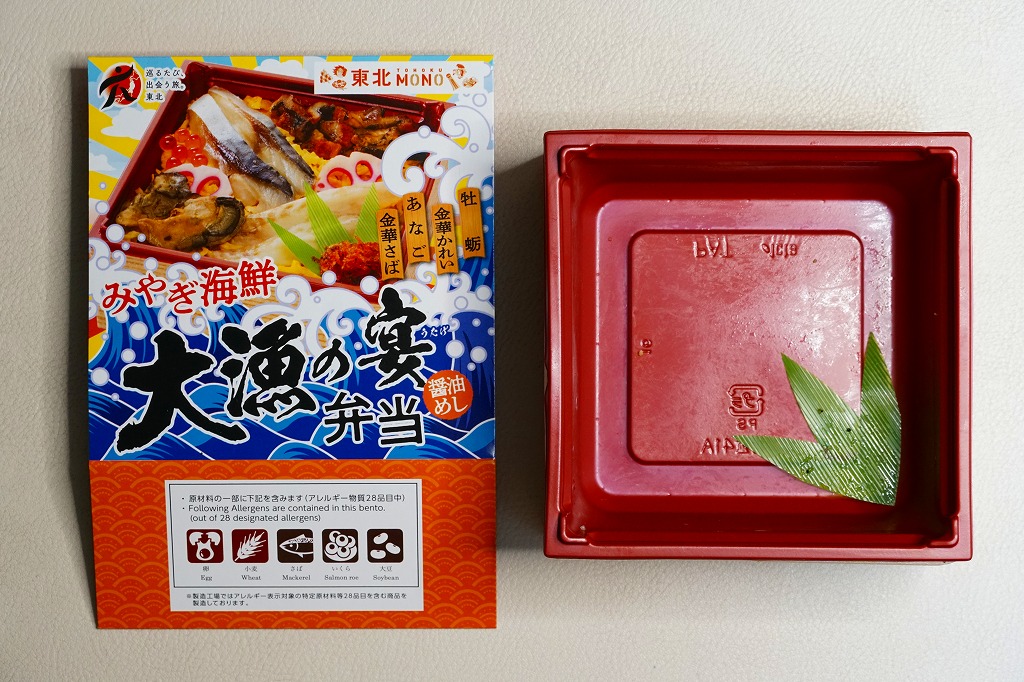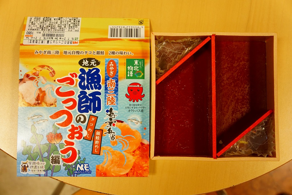小柄で四角い容器に醤油飯を詰めて錦糸卵で覆い、金華さば酢じめ、あなごの蒲焼、炙り牡蠣、金華かれい酢じめ、花こえび佃煮などを並べる。派手なスリーブや東京での販売という印象に違い、中身は酢飯でなく海鮮でもなく、宮城の食材を満載し、食べて味わって満足できる機能的な内容と分量。地味と滋味が備わると思う。調製元のJR東日本クロスステーションは、かつての日本レストランエンタプライズ(NRE)や日本食堂の仙台支店。仙台駅では売られたかどうか。